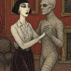 Prompt: Abigail Larson STYLE, red and gold Victorian parlor, VERY TALL slender, pale-skinned VERY BEAUTIFUL LONG NOSED woman with black bobbed hair, Tango dancing with Universal Pictures Boris Karloff The Mummy 1932, GREEN EYES, EGYPTIAN MAKEUP, exquisitely beautiful face, expensive glamorous white COLLARED BUTTON DOWN Victorian blouse, big lace ruffles in front, silver necklace with cross, BELTED purple velvet skirt,