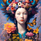 A stunning portrait of a young woman adorned with a floral crown, featuring butterflies and vibrant flowers. Her serene expression blends harmoniously with the enchanting colors of nature.