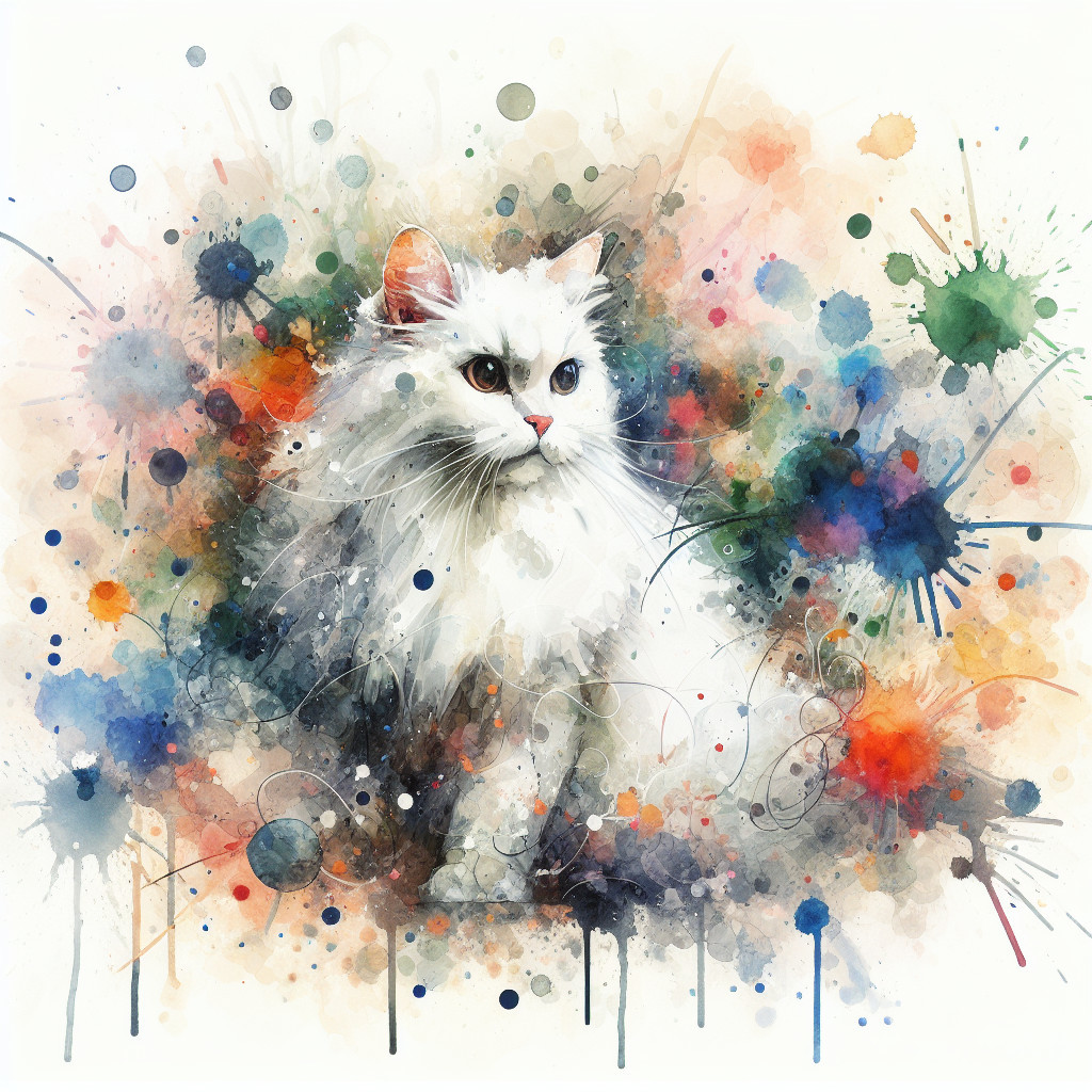 A beautiful white cat with striking green eyes sits gracefully amidst a vibrant watercolor garden of colorful flowers, blending serene elegance with a lively, artistic backdrop.