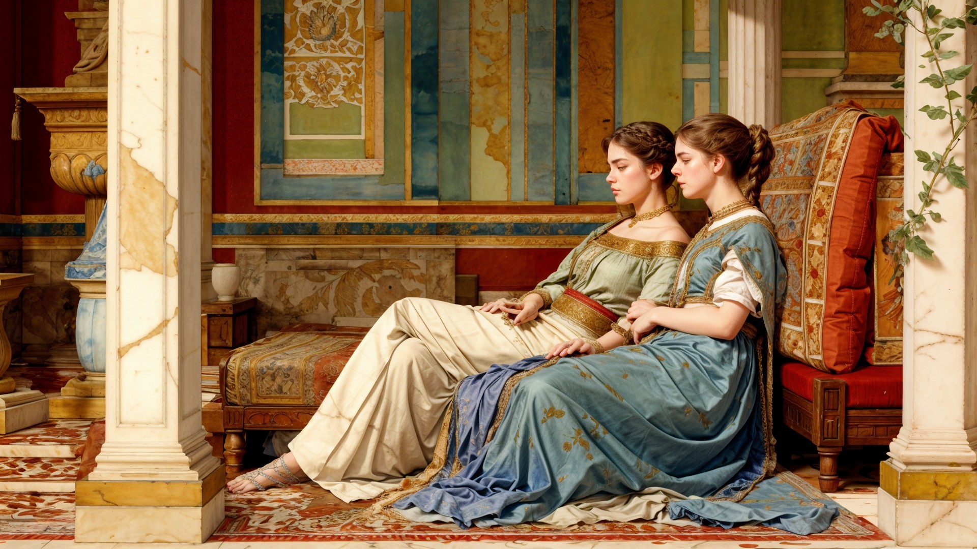 Two elegantly dressed women sit closely together on a ornate couch. They wear soft pastel gowns, featuring off-the-shoulder designs, with intricate details and delicate jewelry, amidst a luxurious setting.