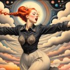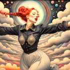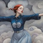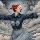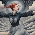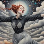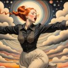 Prompt: Female in ecstasy, precisionism by Morton Livingston Schamberg. Intricate ink, watercolor and chalk masterpiece, Ed Binkley-inspired style, surreal composition influenced by Benno Hauber and pop-surrealism of Paul Kidby, reminiscent of Mark Ryden and Man Ray, levelled off in high plasticity, flabbergasted, excited, exaggerated brightness 1.9, intricate hips and groin, pointilism reference, red lips, very colorful make-up, overexposed lighting, perpendicular edges, great depth and scale, rounded and surreal background without edges, warped landscape as grey and cloudy backdrop, infused with cymatics elements, vibrant color shapes, and asymmetrical flares reminiscent of Miro's style. The artwork should be unique, witty, detailed indiecore with a touch of fantasy. Tetradic color scheme dark-grey light-grey deep-blue metallic-honey, warped accents, flares and panels, estranged coloring, acceptance of moving, asymmetrical upper body portrait. Displacement mapping 1.3, mip-mapping 1.1, parallax occlusion 1.3, polished, grain, hues by Ho Baron, quilling, airy, complex airbrush textures, HDR, blurred watercoloring, airbrush effect, Raytraced shadows, divisionism techniques, luminism, sfumato-effect, cloudy depictions integrated in a liminal mosaic, anisotropic filtering, close-up, detailed clothing with crackles and filaments, stylized linework illustration featuring intricate gouache details and defined dry ink brush outlines, warped cloud motif, tendrils, ivy-like linework shapes, simplistic fractalization in rural decay, bas-relief 1.8, plasticity 1.8, highly fragmented flares, gradient colored stripes, natural inking vibe, various tones of grey in gradients, rectangular shapes in background, stylized styles of Georgia O'Keeffe and Lyonel Feininger and Emily Balvet