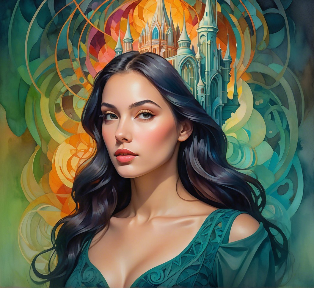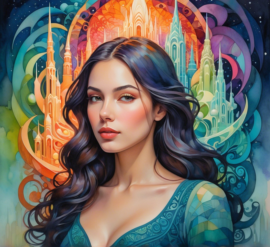 A serene woman with long, flowing hair gazes confidently at the viewer. Behind her, vibrant abstract patterns and towering spires create a magical, dreamlike atmosphere.