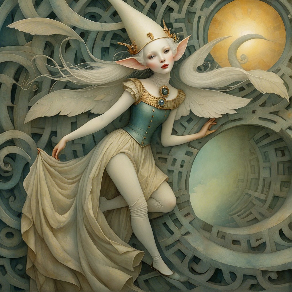 Close up, impish mischievous gorgeous white face creature with a staring into a portal in a luscious maze, in the style of Alexander Jansson. by Catrin Welz-Stein, Michael Parkes. By Rob Gonsalves, Markus Pierson. Bronze tones.