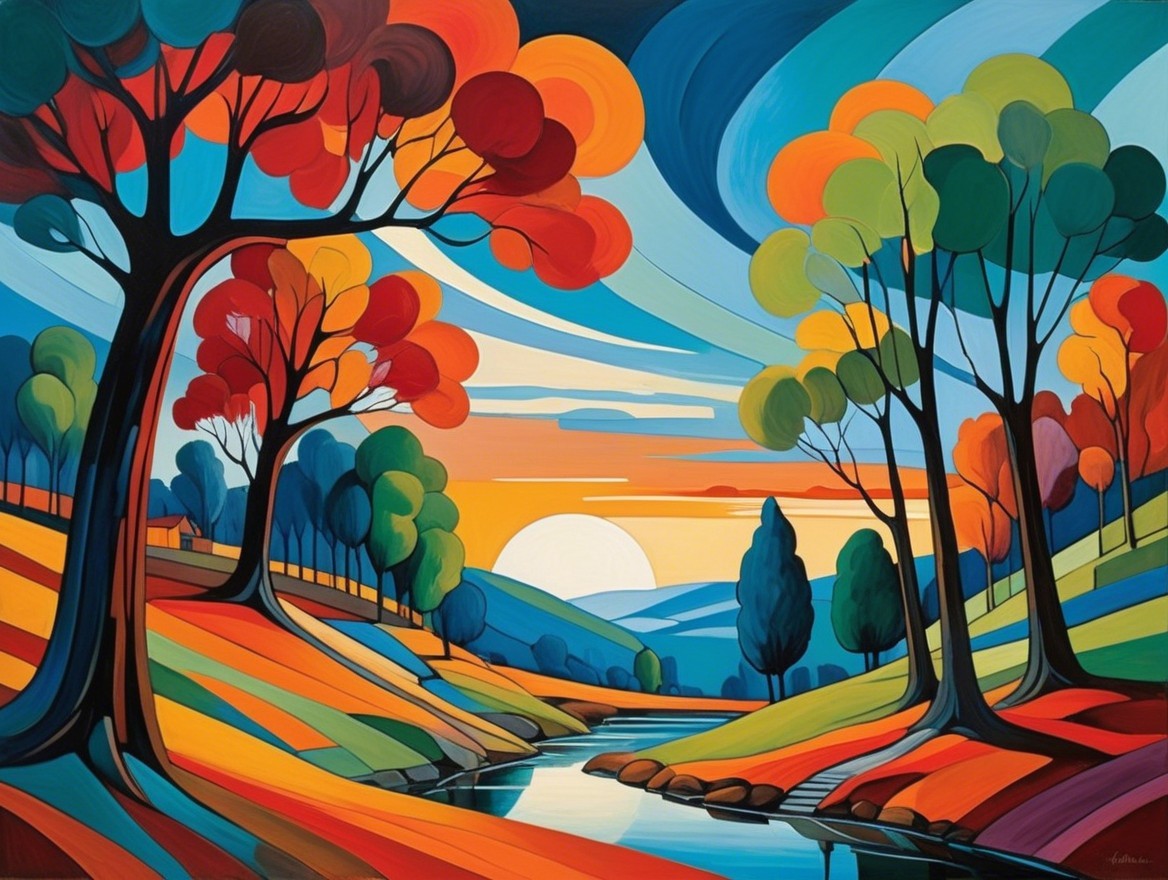 A landscape featuring winding hills and colorful trees is in contrast to a sorrowful man walking along the shore of a small stream.