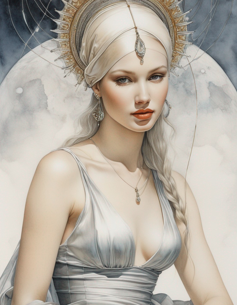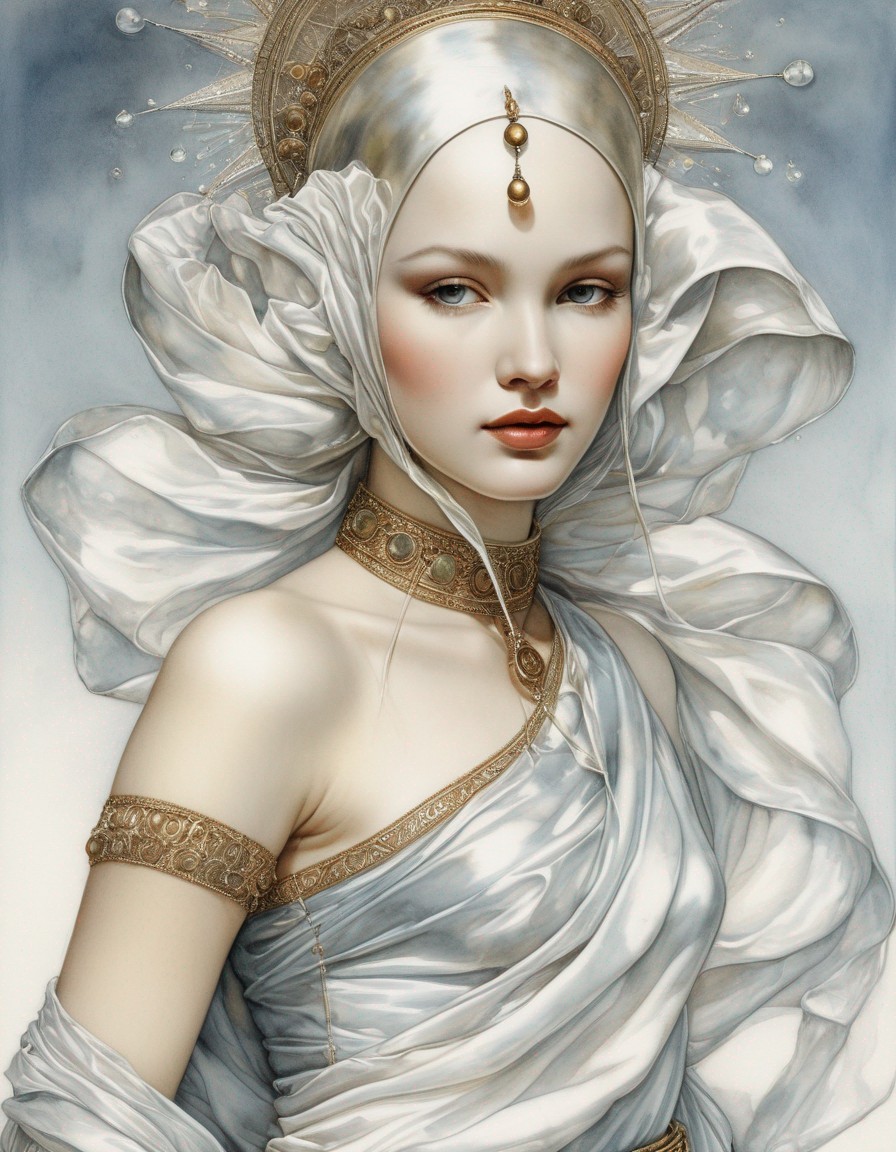 A woman with striking red hair examines a flower amidst a backdrop of pale blooms, evoking a serene, classical beauty.