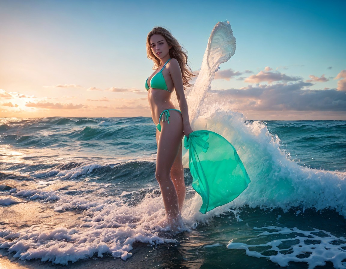 A woman in a turquoise bikini stands by the sea at sunset, with waves crashing and a breeze lifting her sheer wrap.