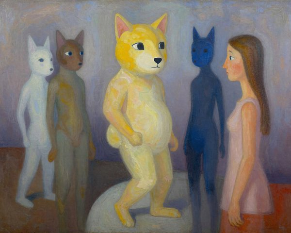 A vibrant portrait of a person with a colorful mohawk hairstyle. The bold background features shades of red and yellow, creating a striking contrast with the expressive colors of the figure.