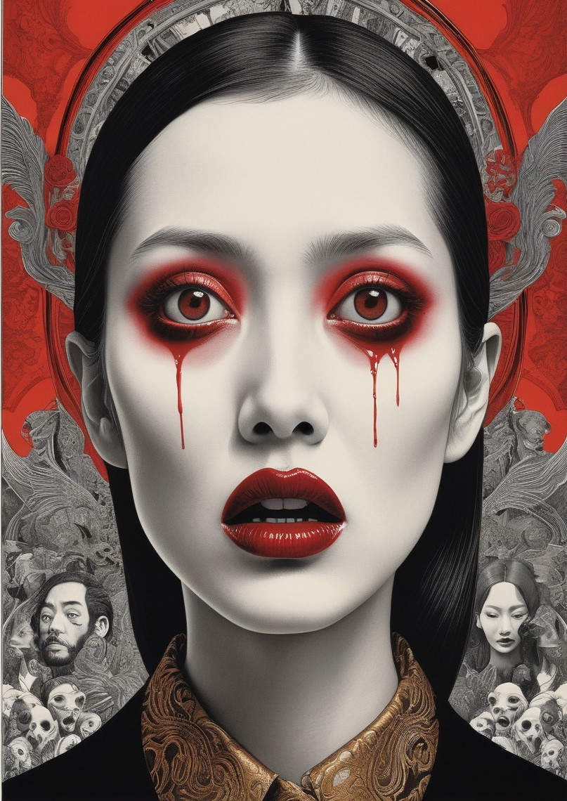 in the style of Junji Ito, Henry Patrick Clarke, Igor Morski, Georgia O'Keefe, Gediminas Pranckevicius and Naoto Hattori. Ink, pen and oil. Sharp contrast. Labial and vulvic Ensure all significant elements are fully within the boundaries.