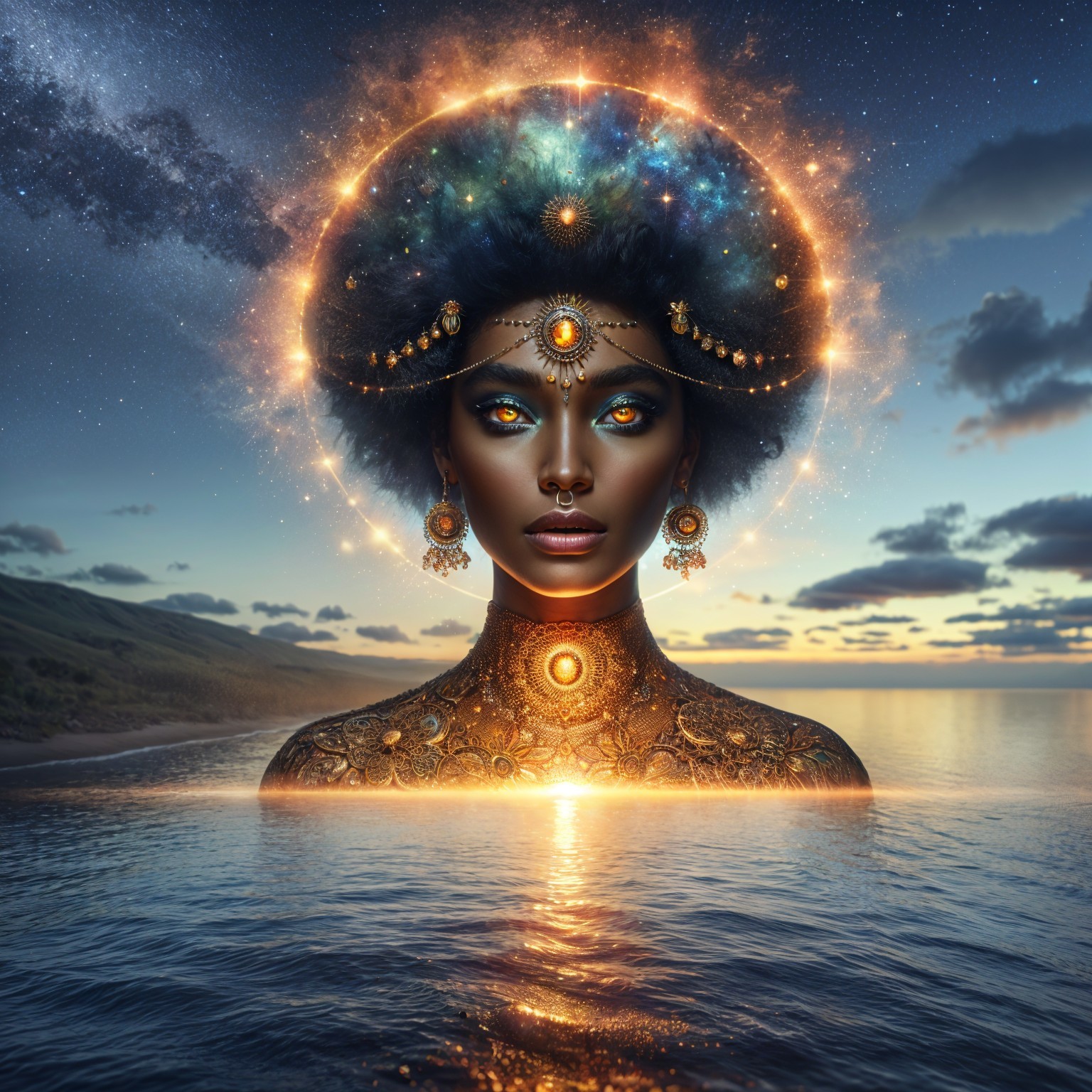 Cosmic Beauty of a Dark-Skinned Woman with Headdress