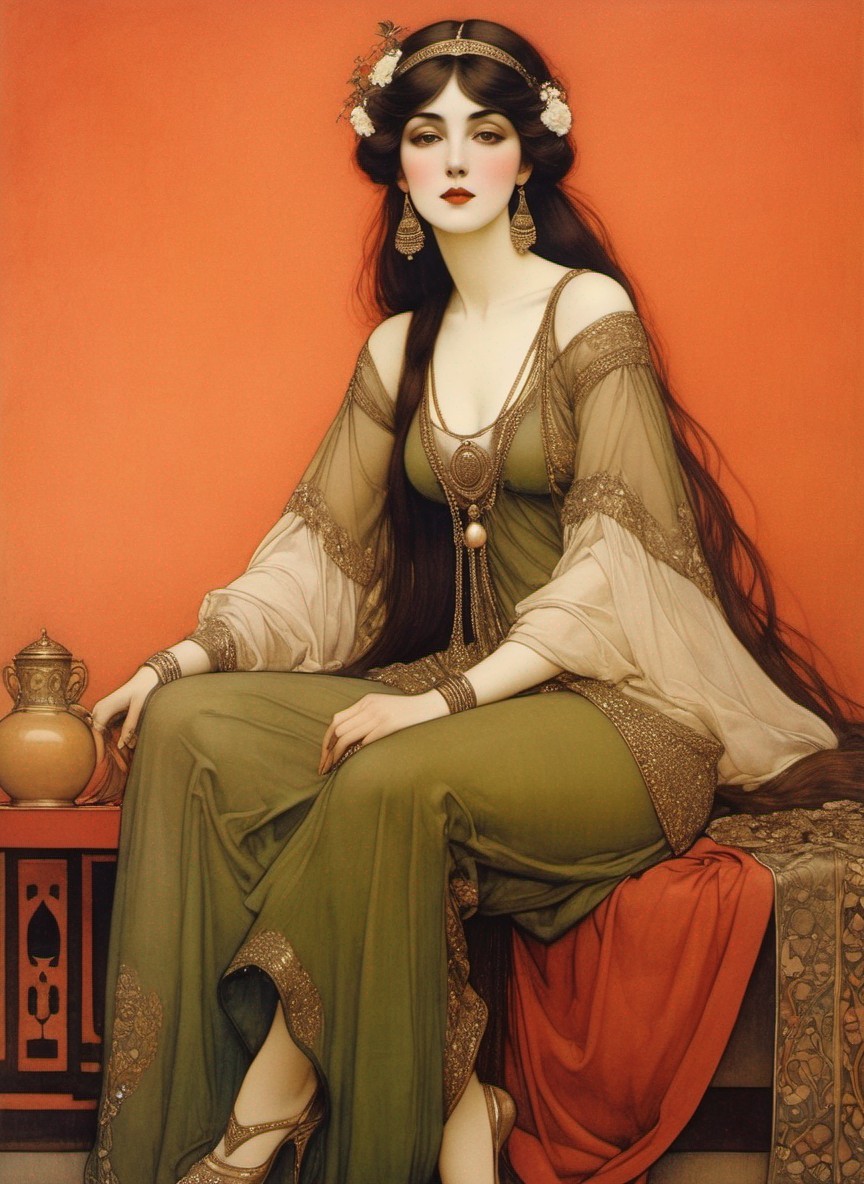 An illustration of a woman in flowing green and orange garments with the Eiffel Tower in the background. She has a regal pose and elaborate headdress.