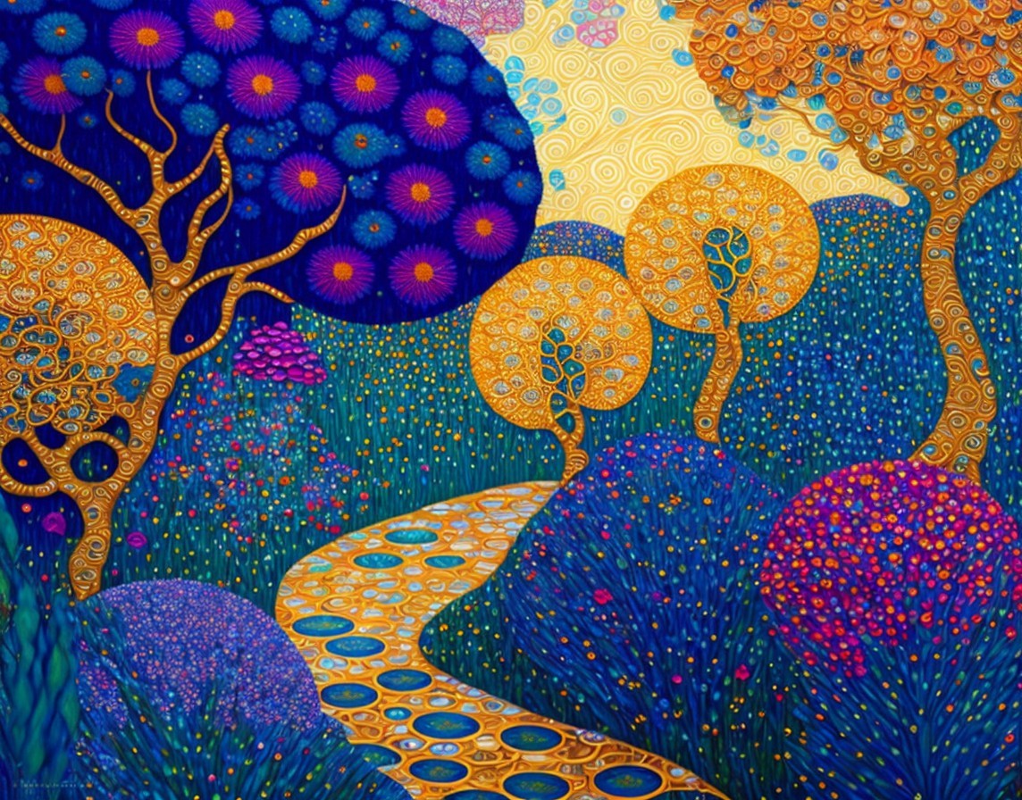 Create an image of a vibrant, fantastical landscape with a winding path leading through an enchanted forest. The trees should have swirling, stylized trunks in shades of gold, with foliage consisting of round, whimsical forms like blooming flowers in rich purples and fiery oranges. The ground is covered with grass in deep blues and greens, dotted with small, multicolored flowers. A clear sky transitions from a pale yellow at the horizon to a light blue at the top, filled with swirling patterns and textures. The path itself is a mosaic of golden and orange hues resembling the surface of a sunlit river. The atmosphere of the scene should convey a sense of wonder and mystical beauty, evoking a world brimming with magic and color.
