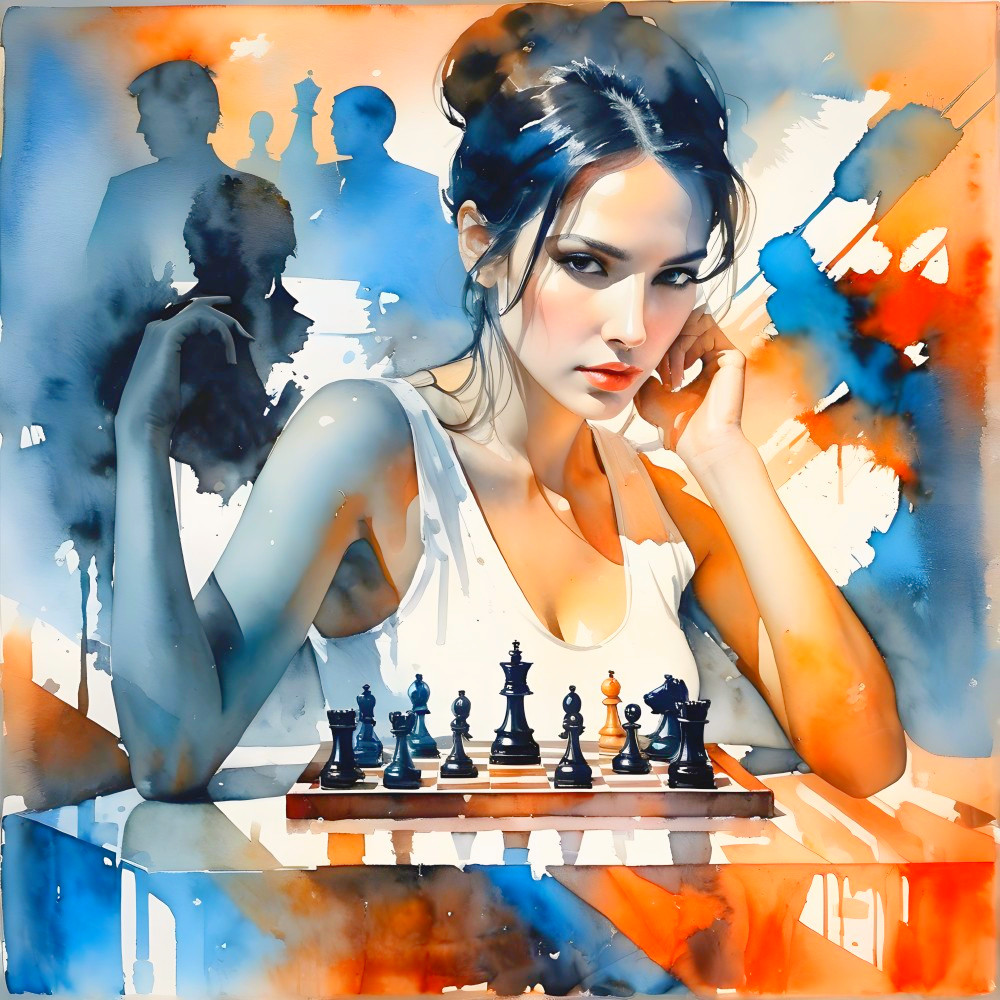 A contemplative woman in a white tank top sits before a chessboard, with vibrant blue and orange watercolor splashes in the background, evoking a sense of strategy and intensity.