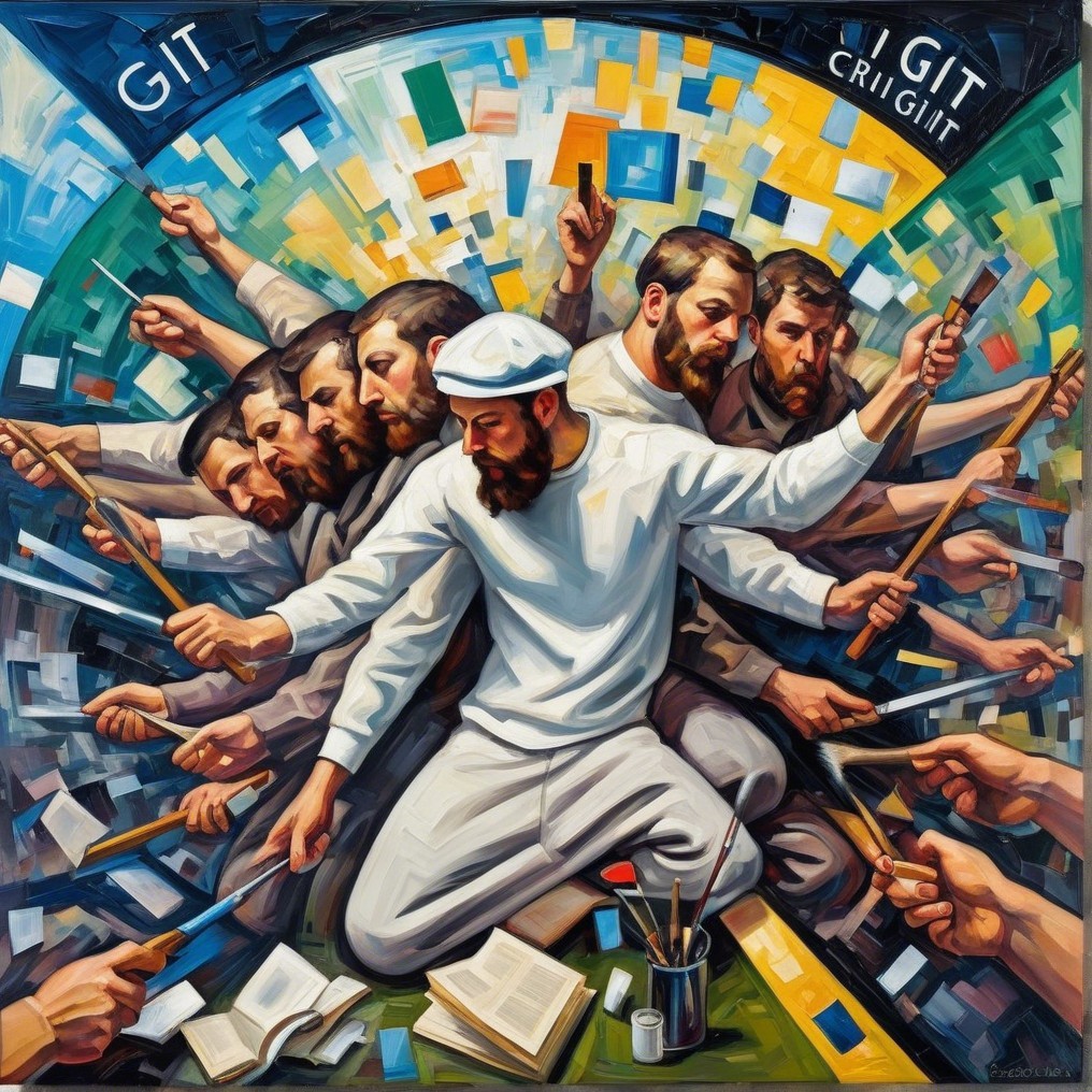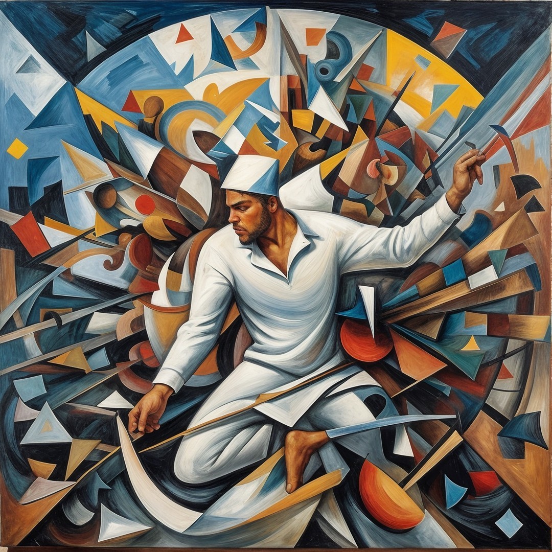 The artwork features a stylized figure amidst dynamic geometric shapes and bold colors. The composition conveys motion and emotion, blending abstraction with the human form in a striking manner.