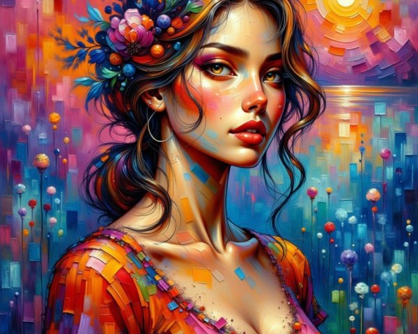 A couple embraces during sunset, with warm hues illuminating their faces. The woman has curly hair and a serene expression, while the man exudes confidence, both radiating connection and warmth.
