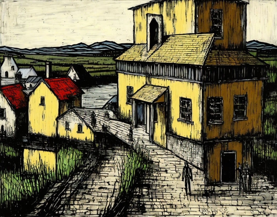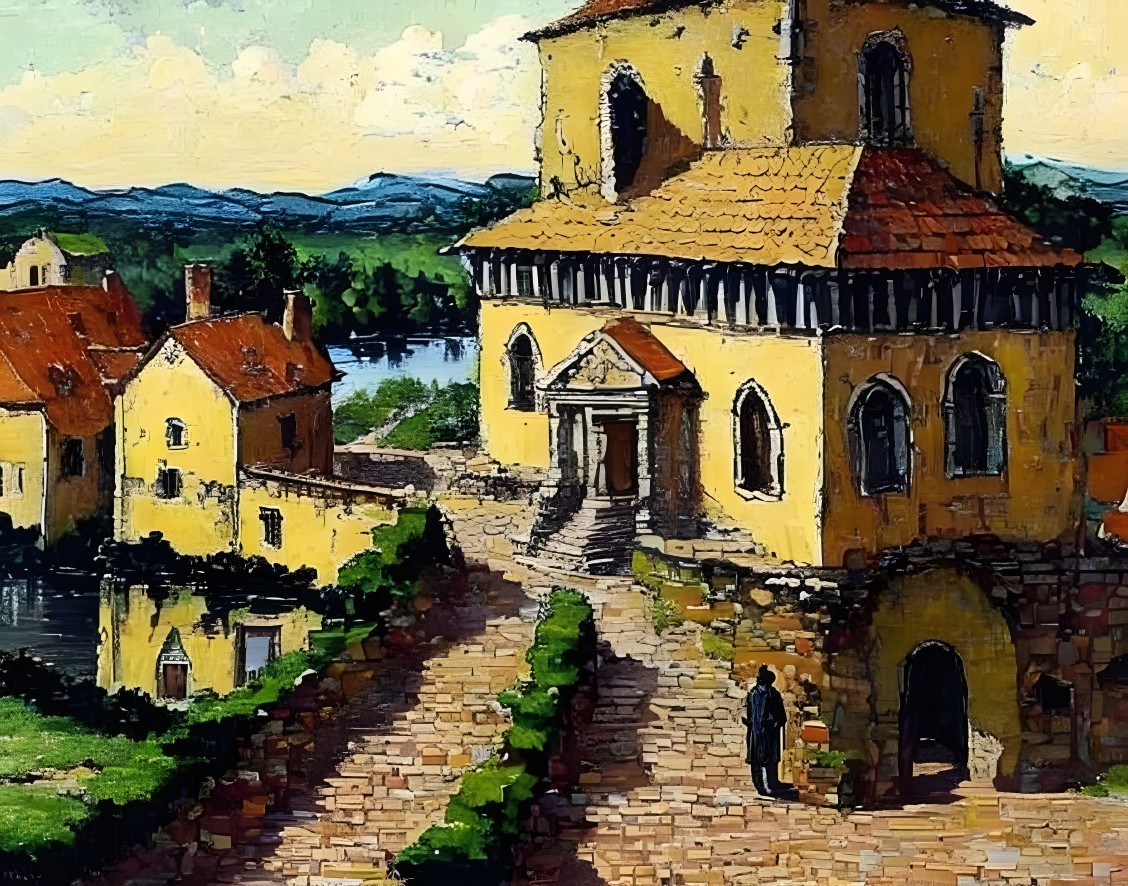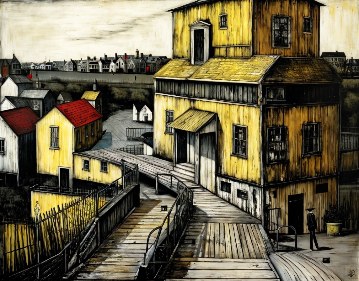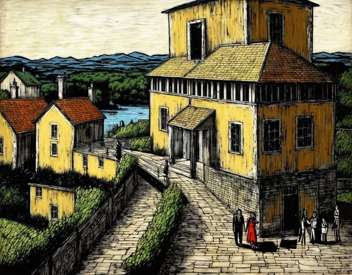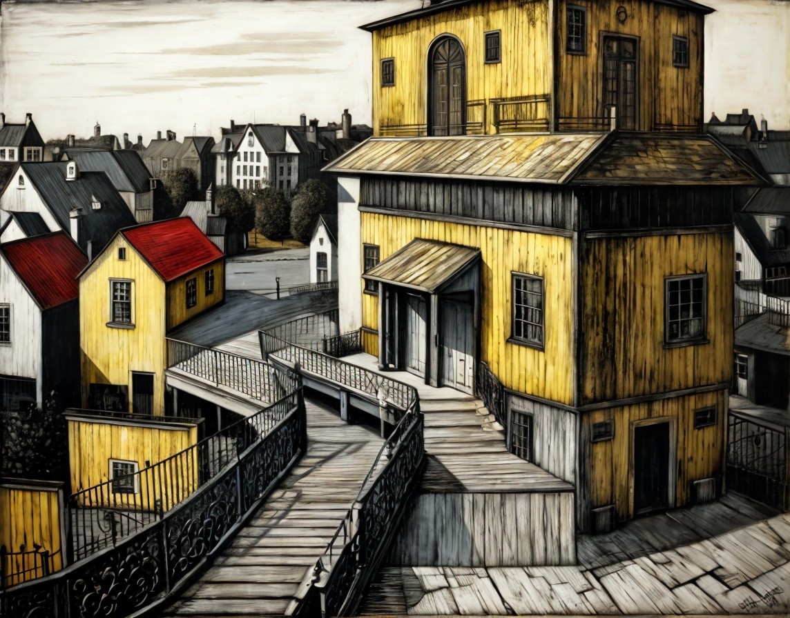 A surreal artwork depicts an Escher-like impossible structure with stairs and yellow buildings in a traditional European town setting.