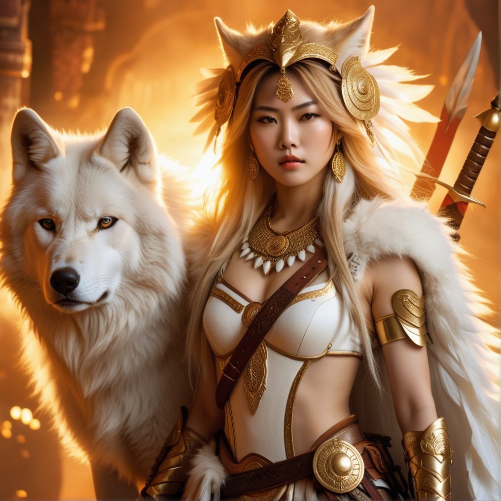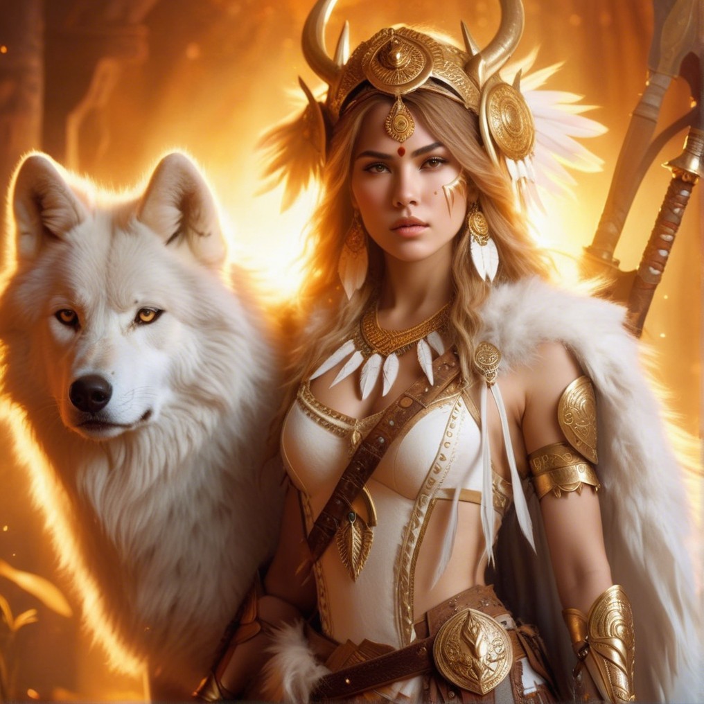 An illustration of a warrior woman with white wolf features and an actual wolf beside her, set against a golden fantasy backdrop.