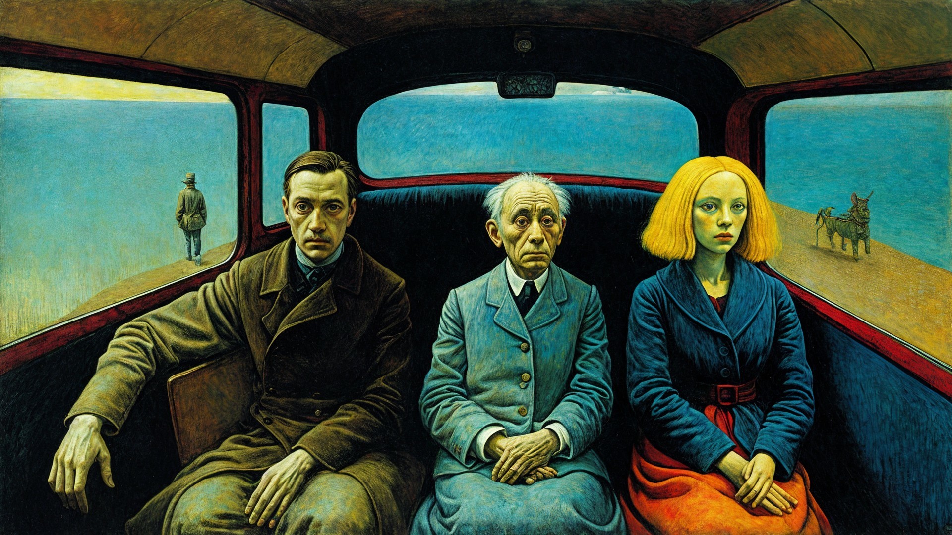 A somber scene in a train car portrays three passengers: a man, an elderly woman, and a woman with bright blonde hair, all seemingly lost in thought, alongside a watchful orange cat. Modified original Prompt: