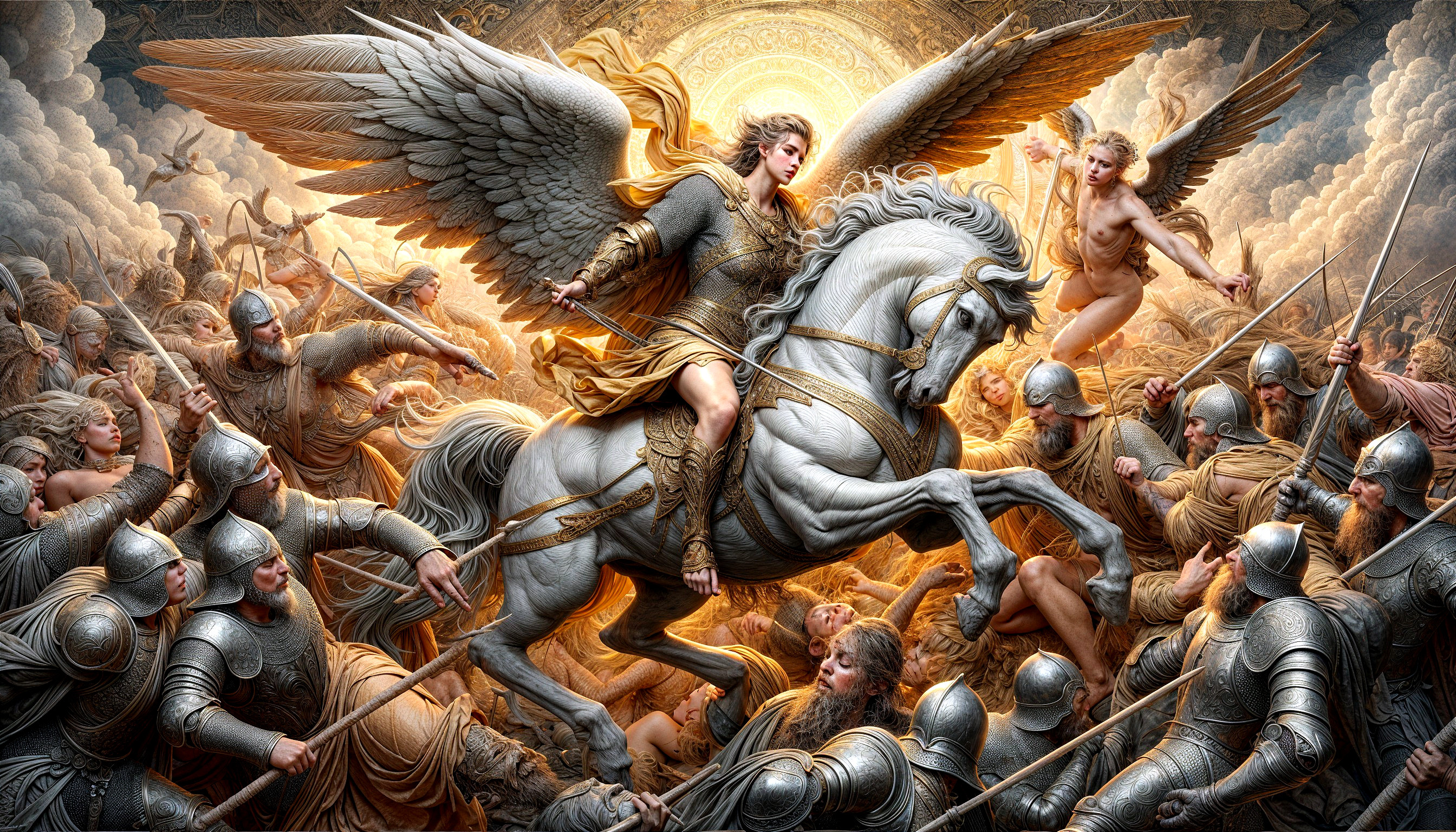 This stunning oil painting depicts a fierce battle scene with a captivating figure riding a horse, showcasing intricate details in facial features and clothing. The warm yellow and gray palette enhances the hyper-realistic style, creating a vibrant and powerful atmosphere.