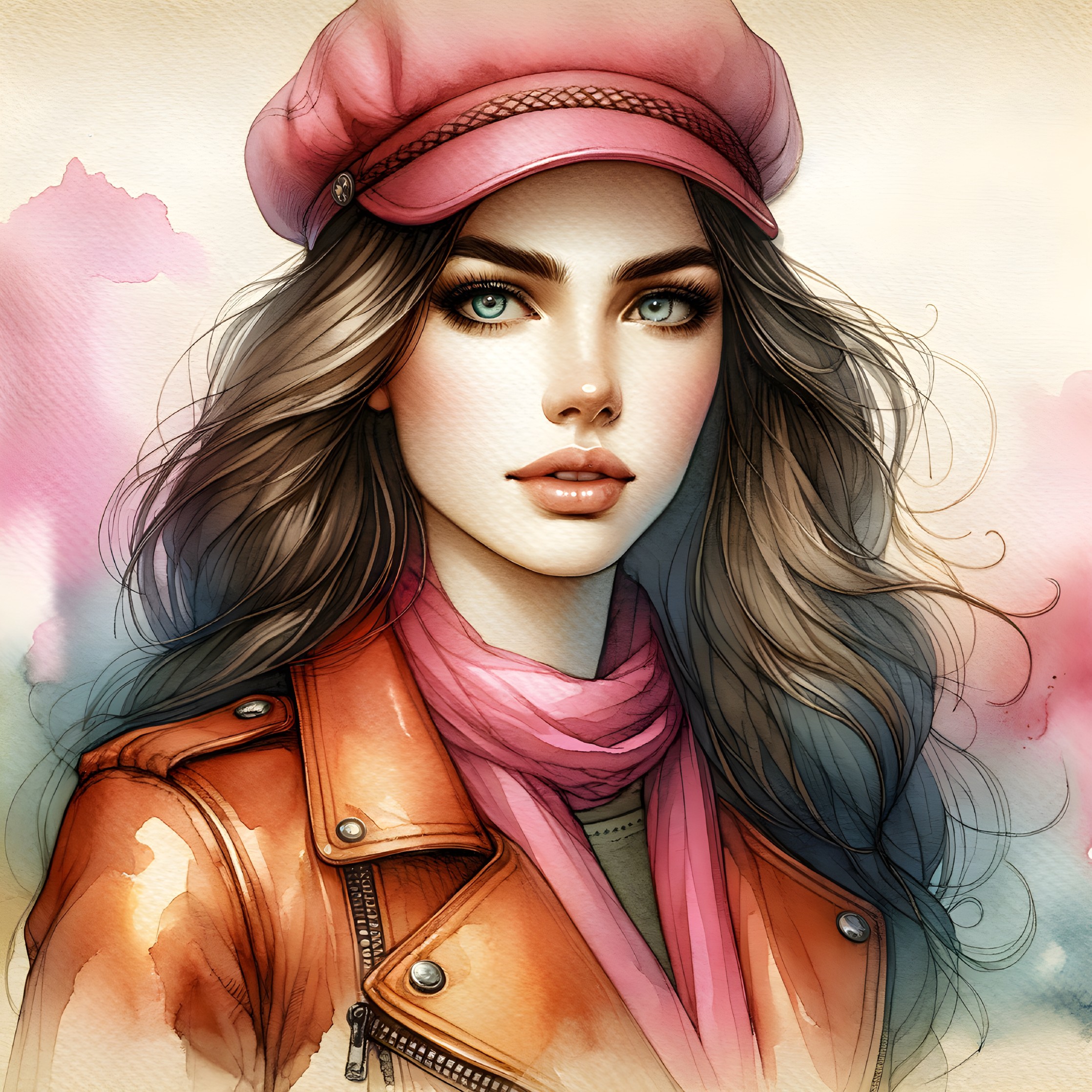 A striking illustration of a young woman wearing a pink cap and stylish leather jacket, with long flowing hair and captivating eyes, set against a soft, watercolor background.