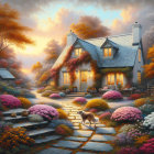 A charming cottage surrounded by vibrant autumn flowers and lush greenery, with inviting windows glowing warmly as a dog stands on the path, enjoying a peaceful evening.