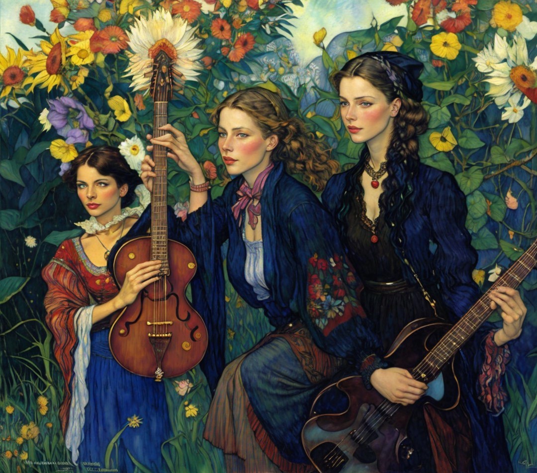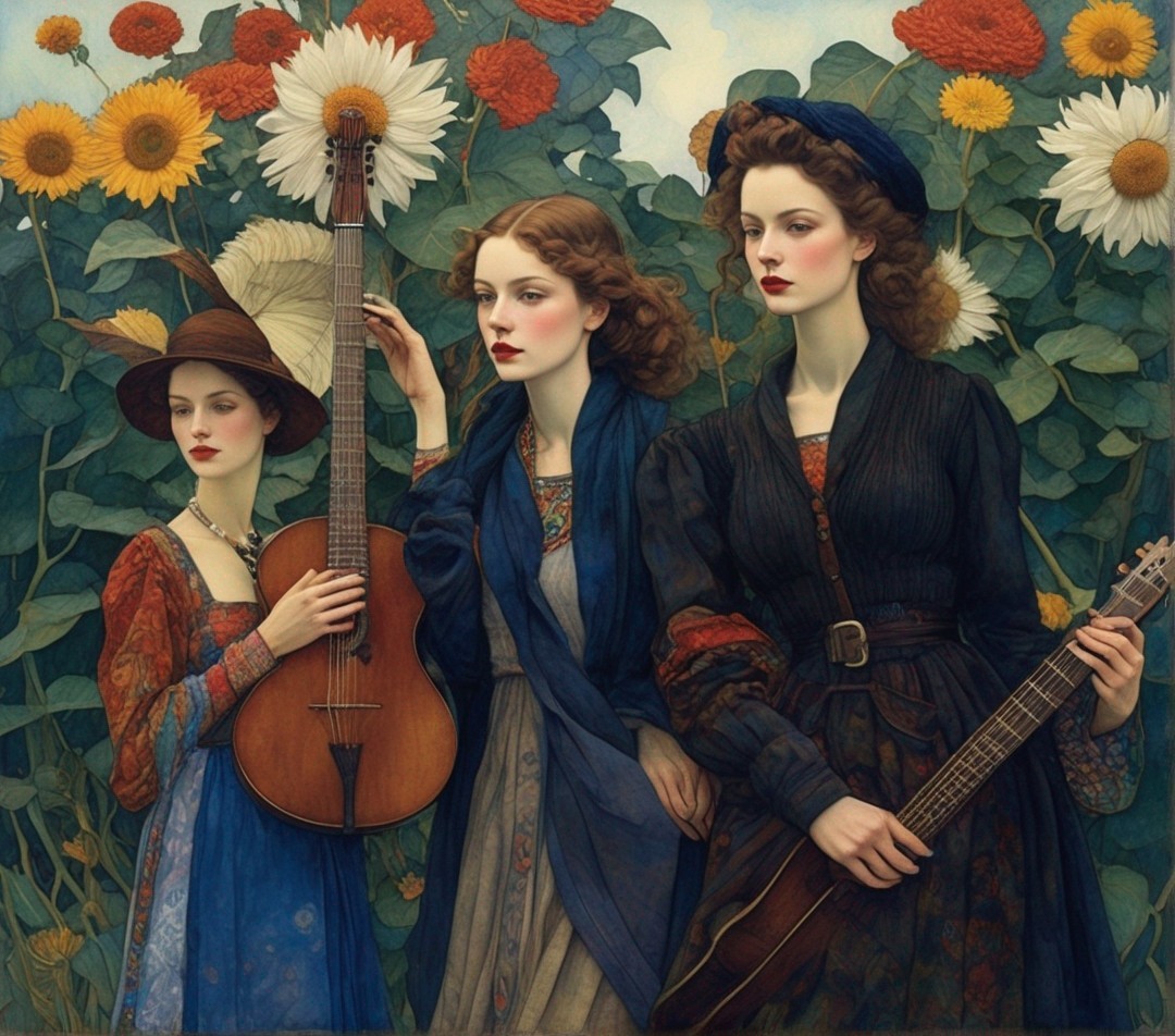 Two women and a man in vintage clothing standing amidst fall foliage, evoking a romantic, historical ambiance.