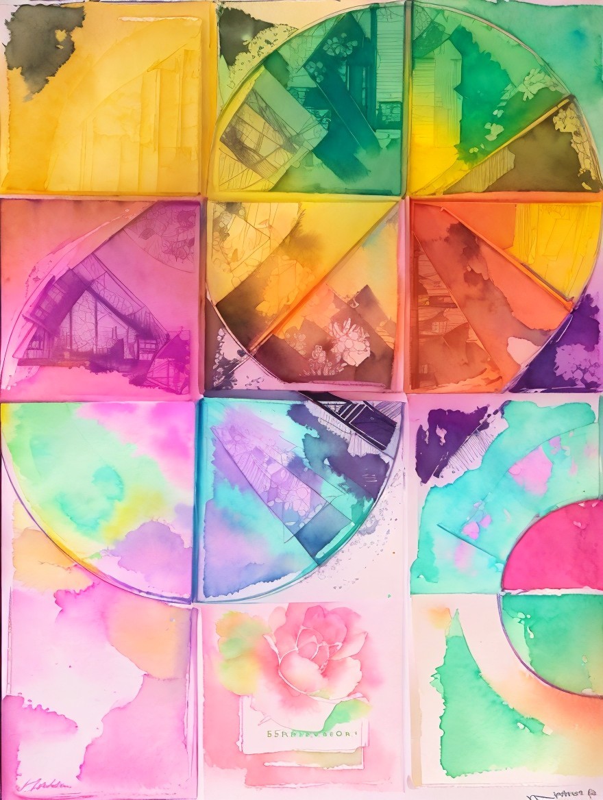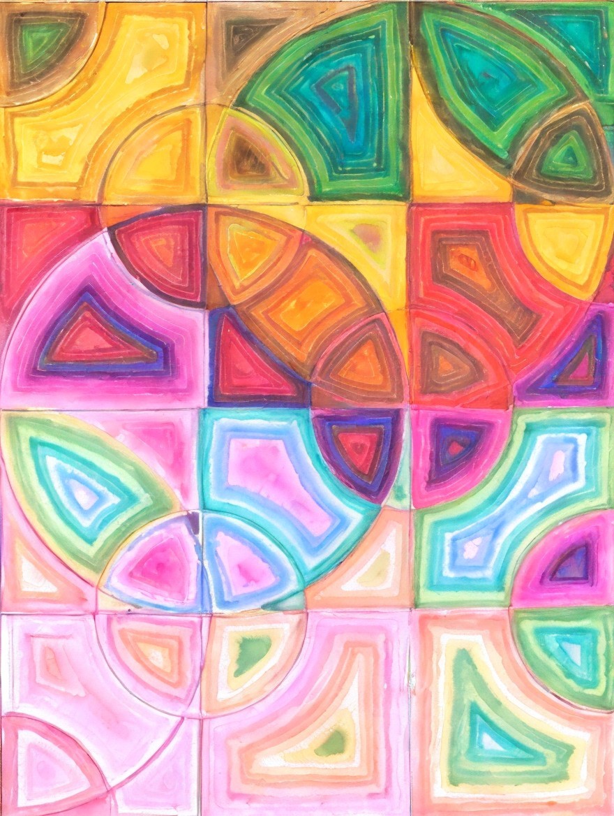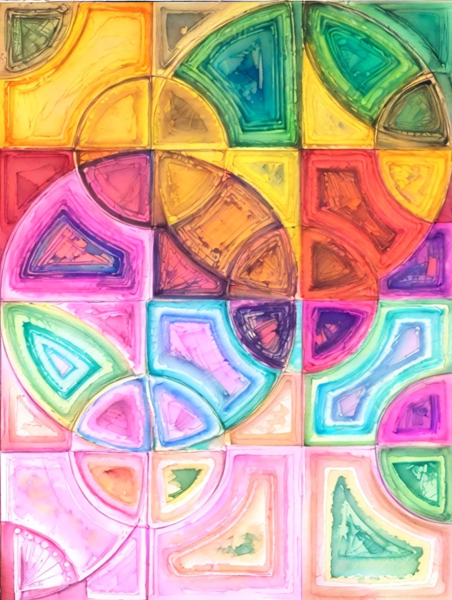 A colorful abstract painting with a circular motif resembling umbrellas in a vibrant, watercolor style, showcasing a spectrum of hues.