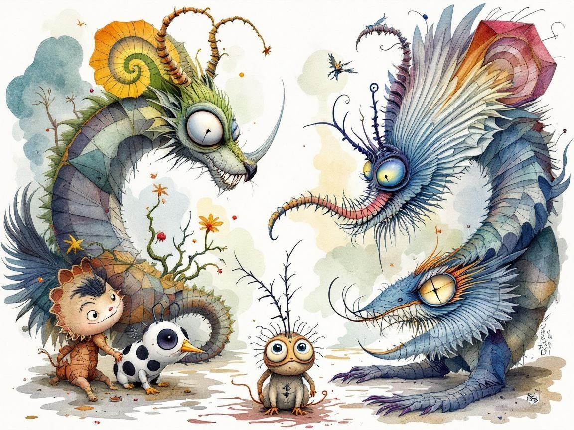 Two whimsical dragons or serpents with oversized cartoon eyes are on the left and right sides of the image. The dragon on the left is green and grey, with a golden snail-like shell on its head and thorny vine-like antlers. Its segmented body is adorned with sparse flowers and small, g