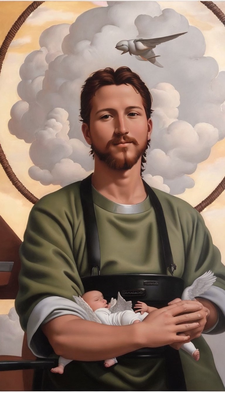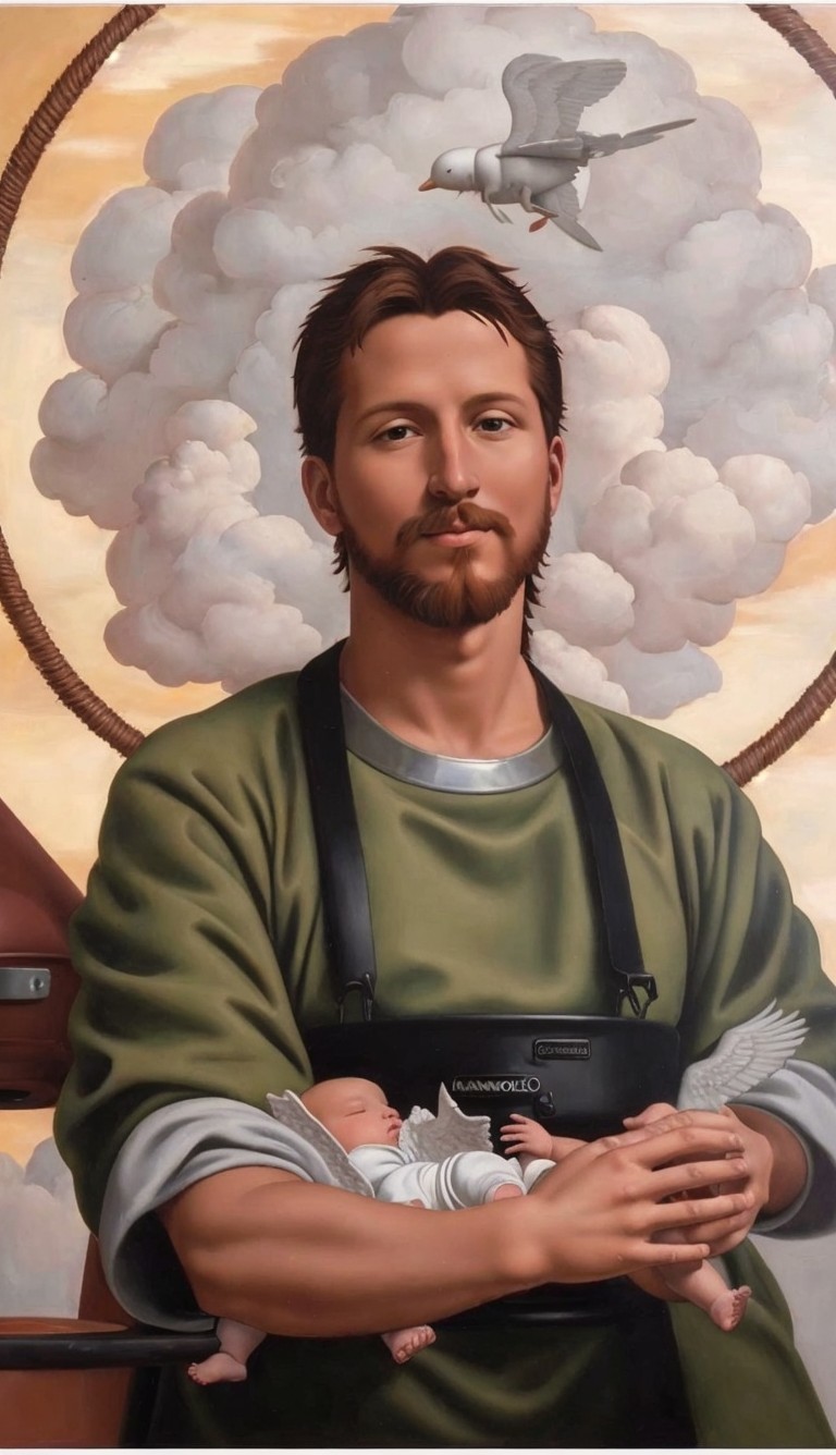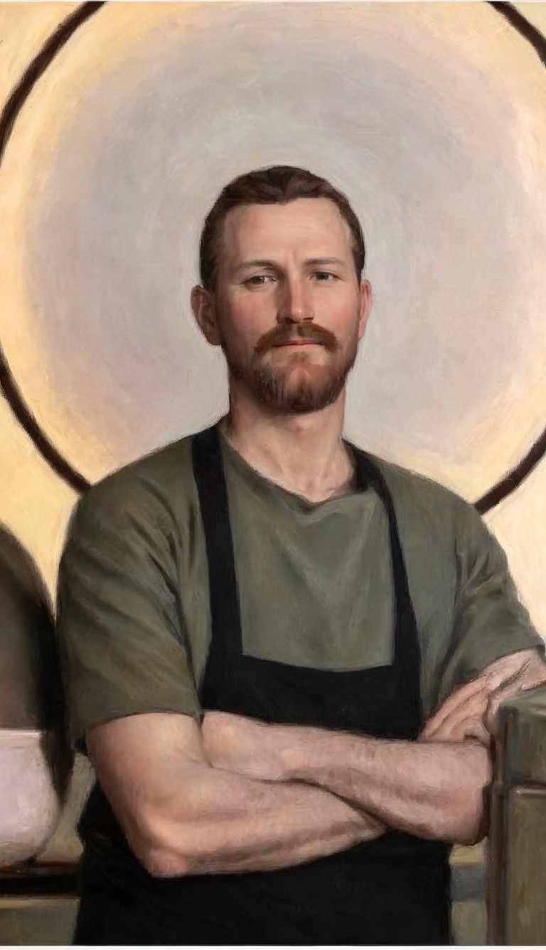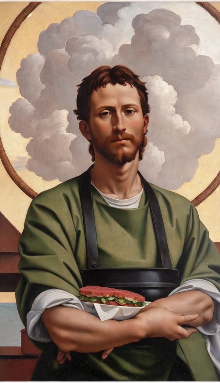 A stylized painting of a man with brown hair and a beard, wearing a green tunic and black belt, holding a sandwich, with a seascape background.