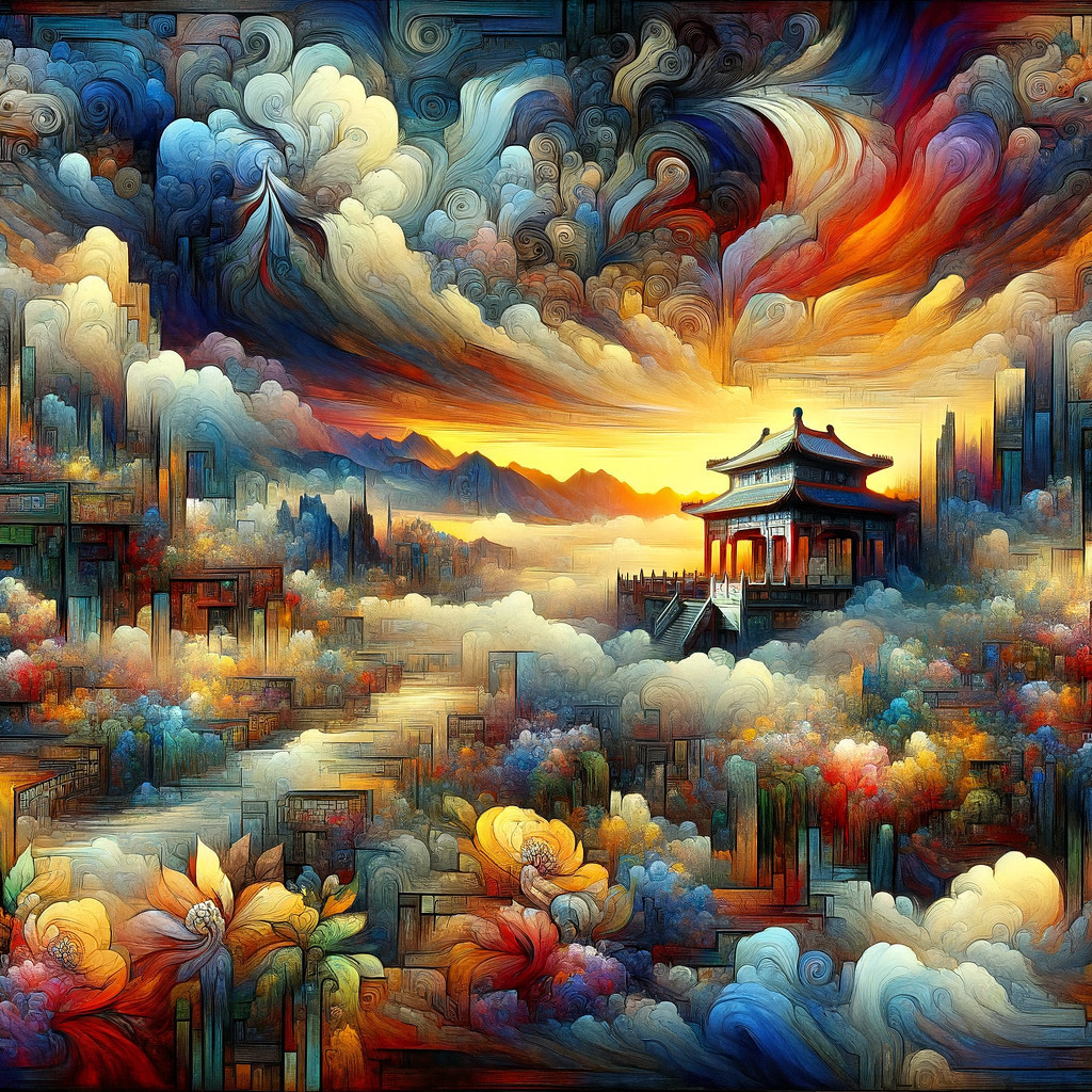 The image showcases a vibrant, swirling sea filled with dynamic waves and a serene boat. Bright colors highlight pagodas and birds, creating a harmonious blend of nature and structure.