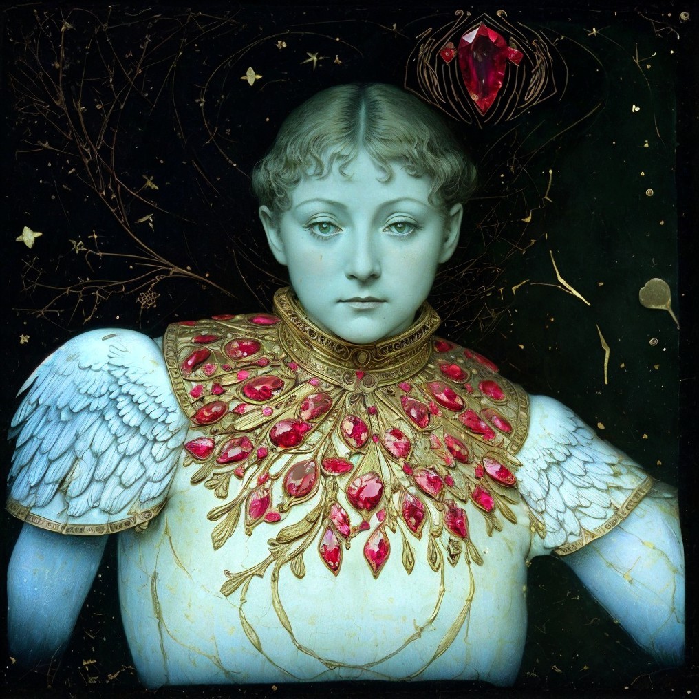 Artistic portrayal of an angelic figure with white wings, adorned with gold and rubies, against a starry backdrop.