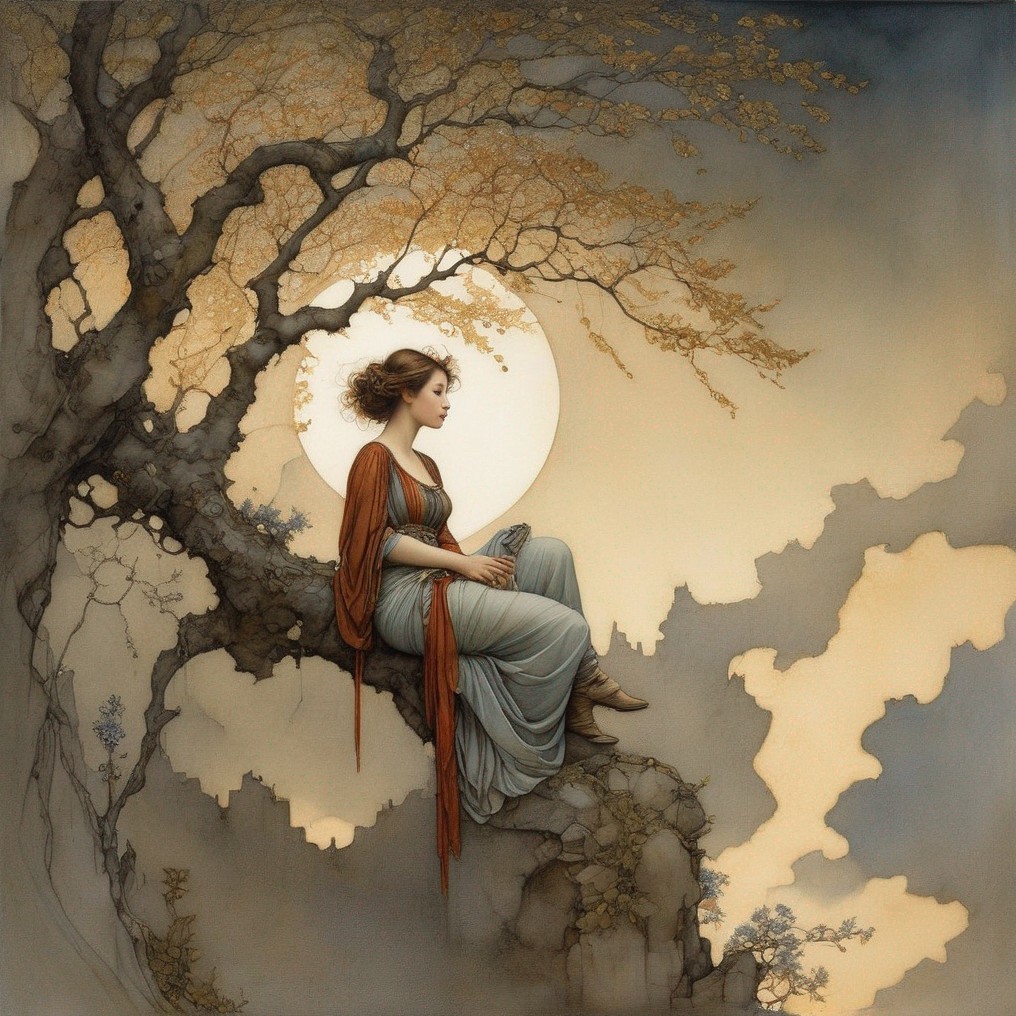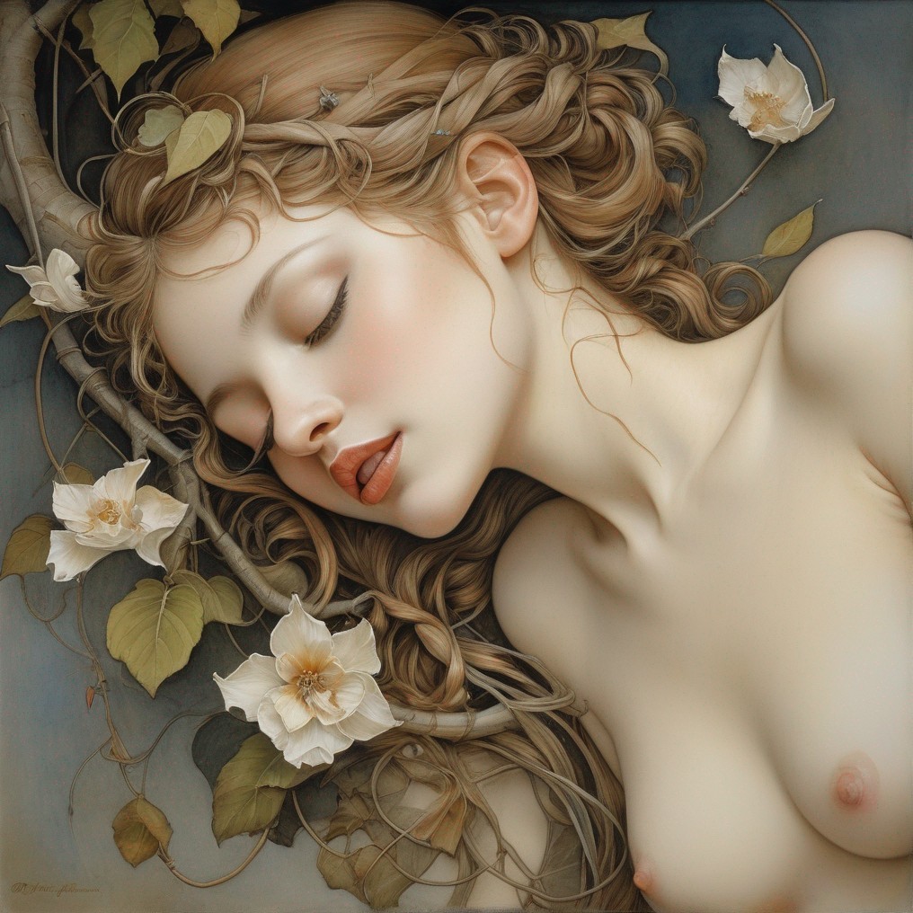 A painting of a woman with intricate hair, resting against a tree with leaves and berries, showcasing delicate features and a serene expression.