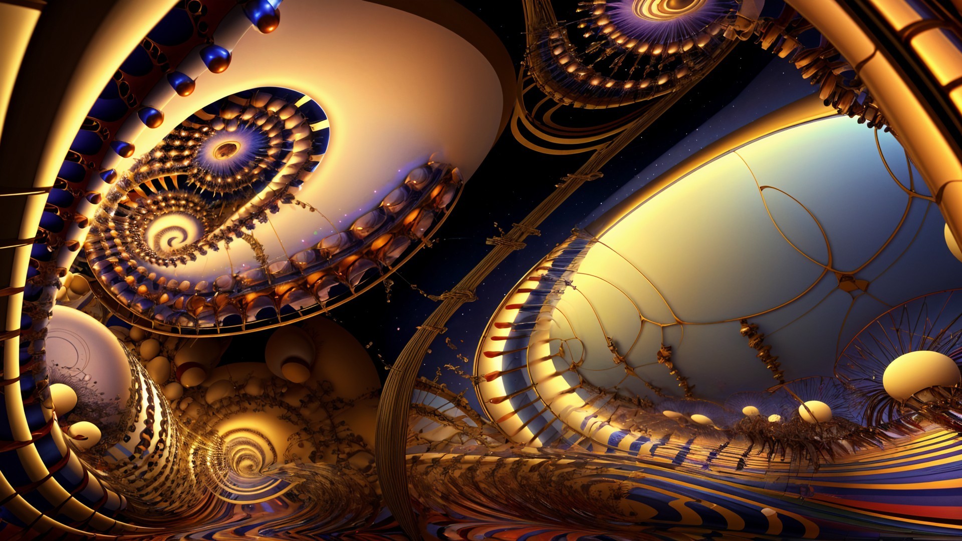 A surreal cosmic landscape with flowing, spiraling lines in vibrant colors. Clouds and spherical forms create a dreamlike atmosphere, evoking a sense of wonder and exploration in the universe.
