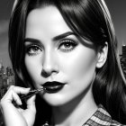 A striking black-and-white portrait of a woman with long, dark hair and bold lipstick, holding a toothpick. The background features a dramatic cityscape with dark, Gothic architecture.