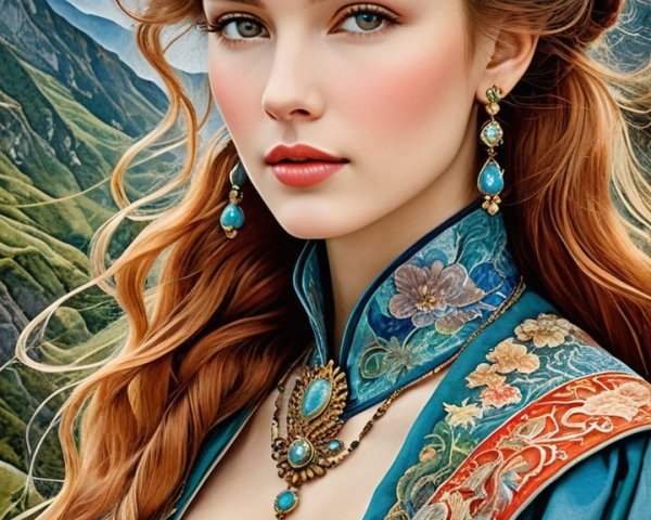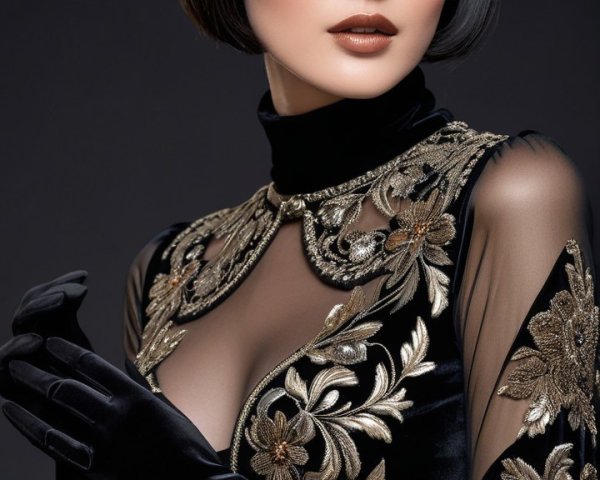 A striking gothic surreal scene features a confident blonde woman in a translucent pale-blue lace dress, riding a wild black stallion. The stormy sunset sky and blooming roses enhance the emotional, mysterious atmosphere.