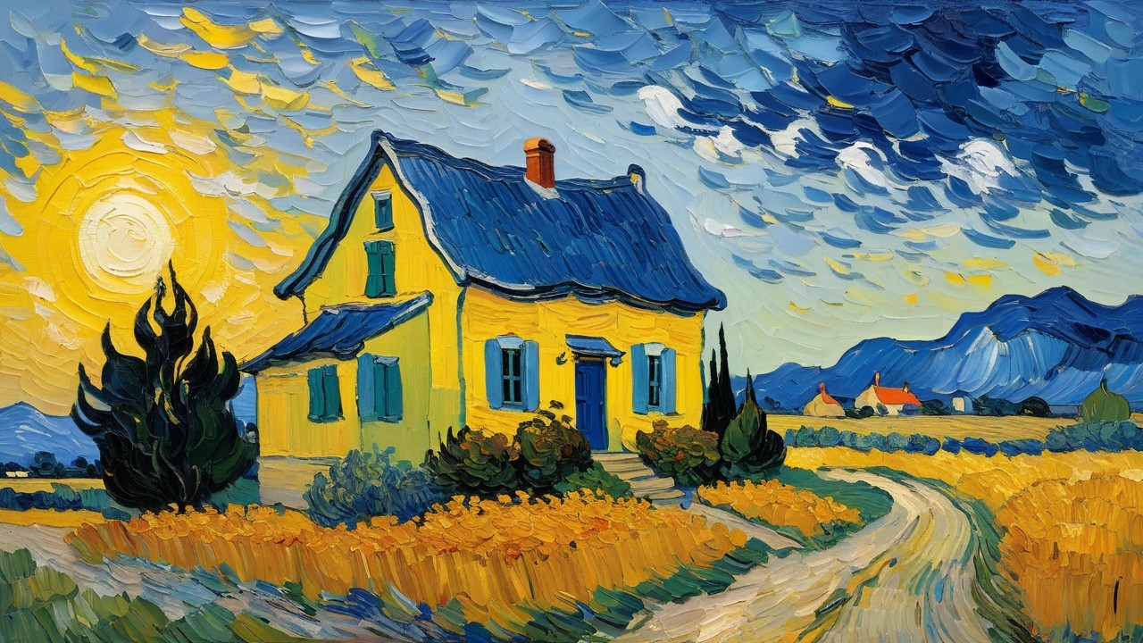A vibrant, impasto oil painting in the style of Van Gogh depicts a yellow house with a blue roof and blue shutters, sitting amidst a golden field of wheat. The house has a red chimney and a blue front door with a small overhang. To the left of the house, a dark, cypress