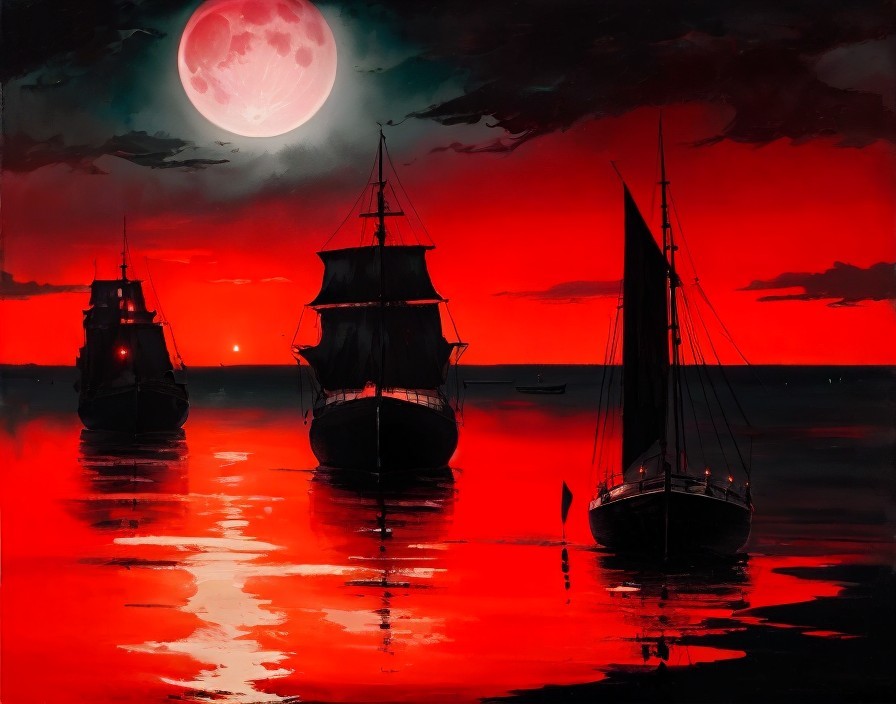 Prompt: An atmospheric impressionist and noir painting using liquid oil textures of black and red, showcasing a moonlit waterfront scene with docked noir-era boats, their silhouettes cast against the rippling waves in a haunting crimson hue.
