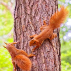 Two playful red squirrels are climbing a textured tree trunk, their fluffy tails and vibrant fur catching the light. A soft, blurred background enhances the serene forest ambiance.