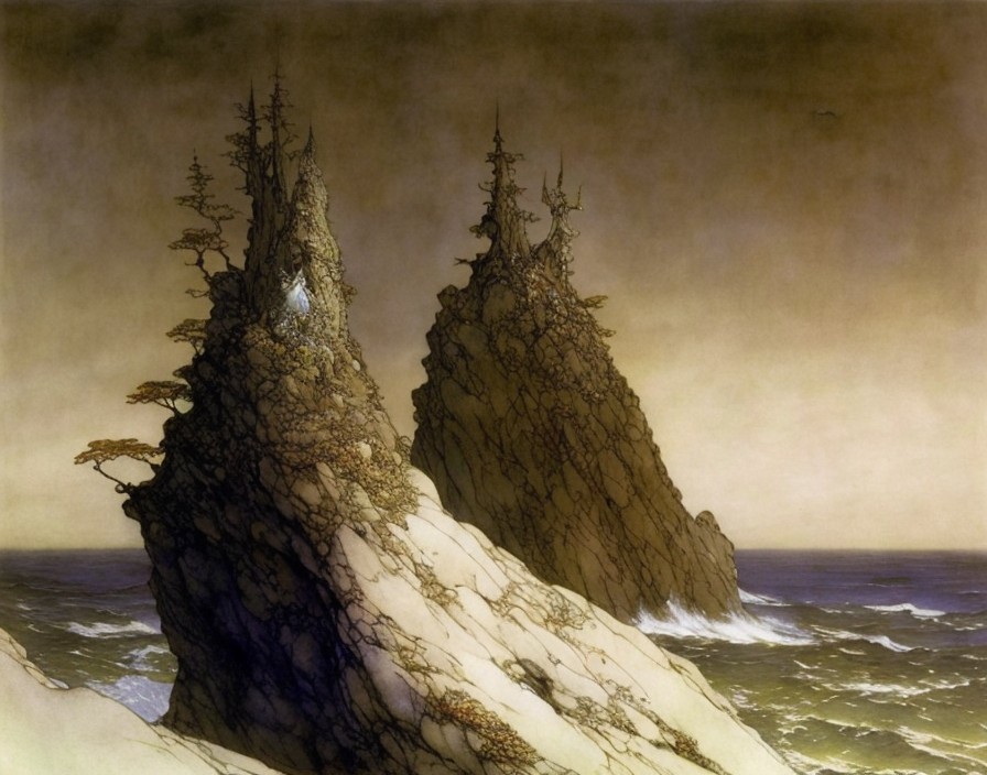 A green, winged creature perches on a rocky cliff, gazing at a distant castle atop a jagged peak, under a moonlit sky. The scene is eerie, with dark clouds and turbulent waves below.