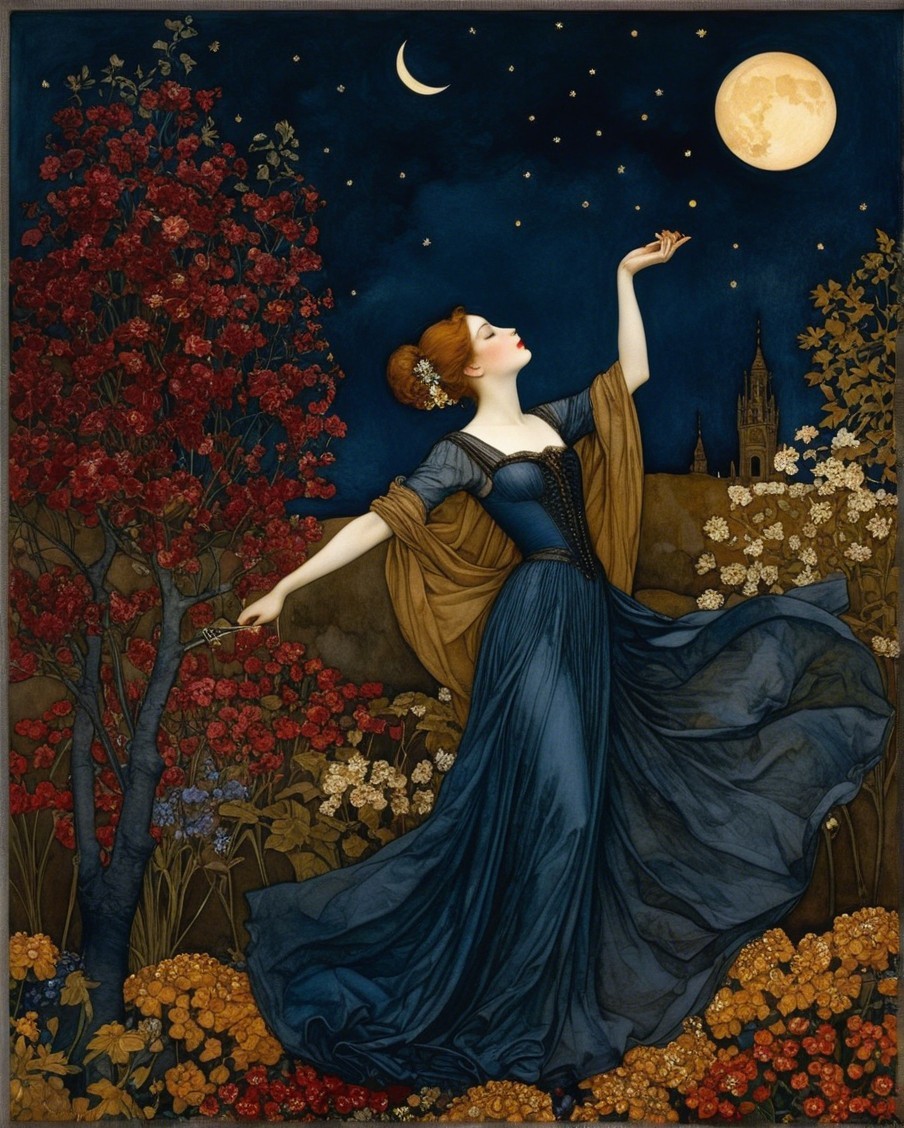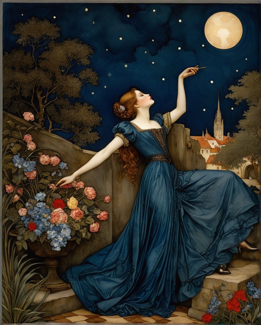 A serene woman in a flowing blue gown lounges against a stone wall under a moonlit sky, surrounded by blooming flowers and stars, radiating elegance and tranquility.