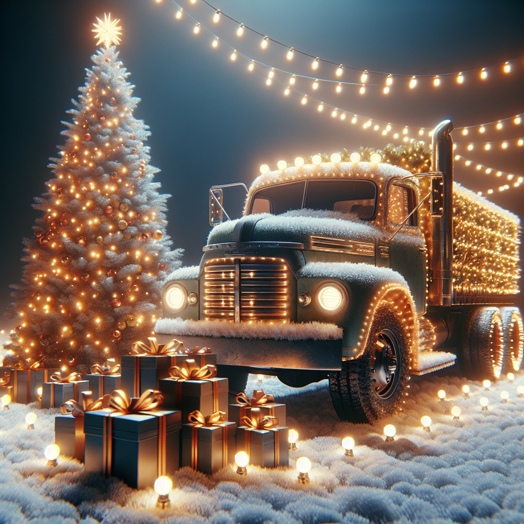 A festive green truck decorated with lights is parked in a snowy landscape, surrounded by Christmas trees and wrapped gifts. A cozy house with warm lights glows in the background.