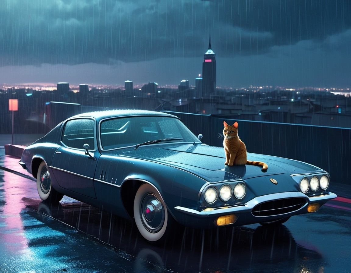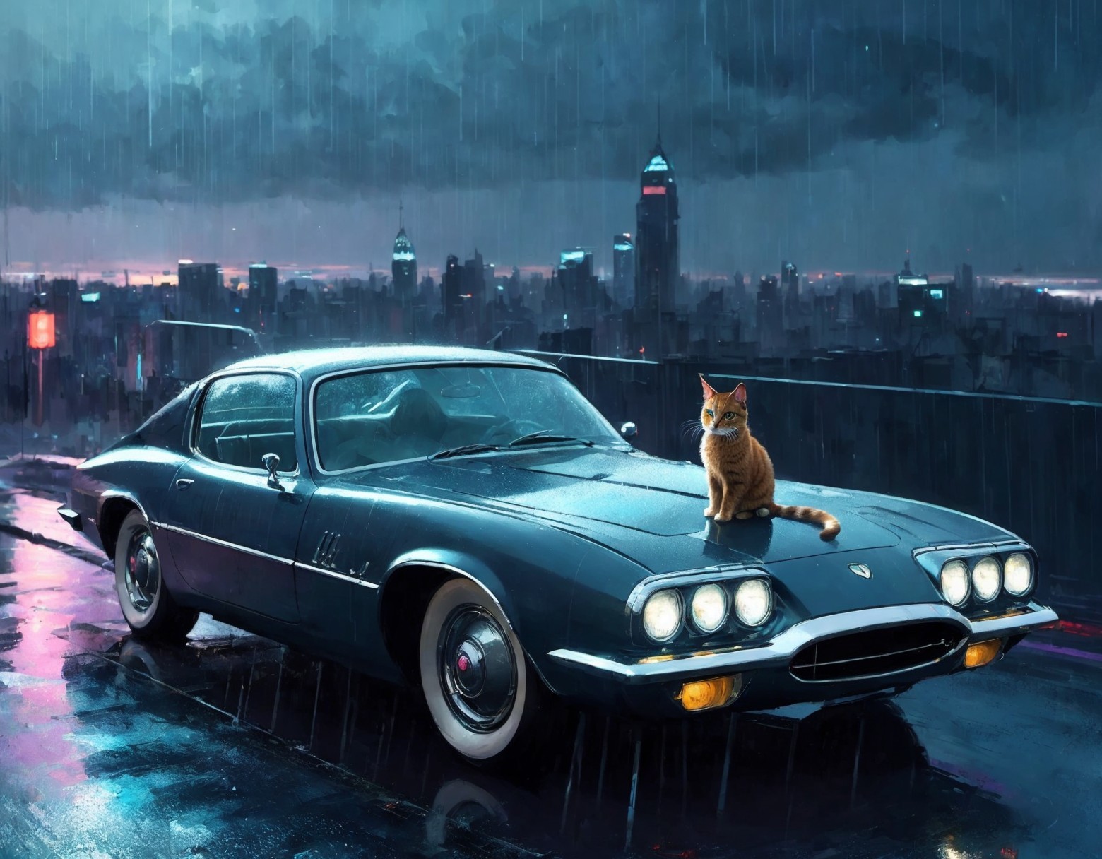A ginger cat sits atop a classic car on a rainy cityscape, with neon-lit skyscrapers in the background.