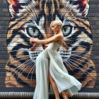 A couple embraces in front of a striking mural of a cat, with the woman in a sheer white dress and the man in a sleek white outfit. The colorful backdrop adds a playful vibe to the scene.
