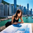 A woman sketches architectural designs by a serene waterfront, surrounded by modern city skyscrapers and boats. Her focus reflects creativity and harmony between nature and urban life.