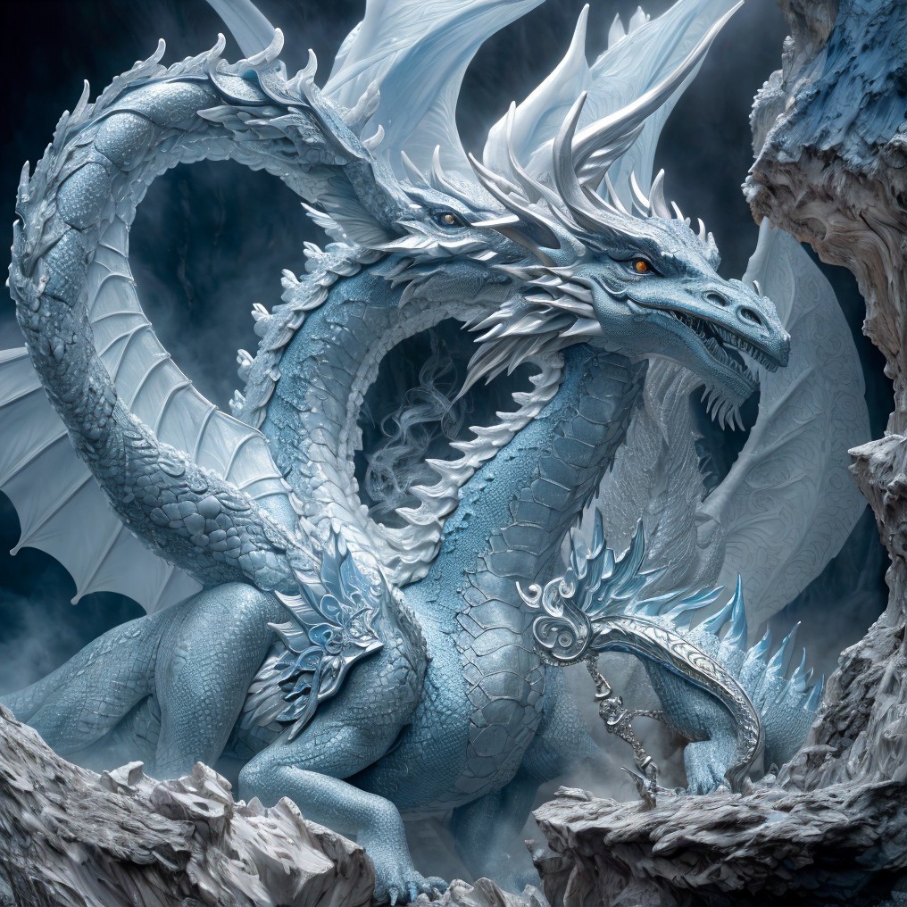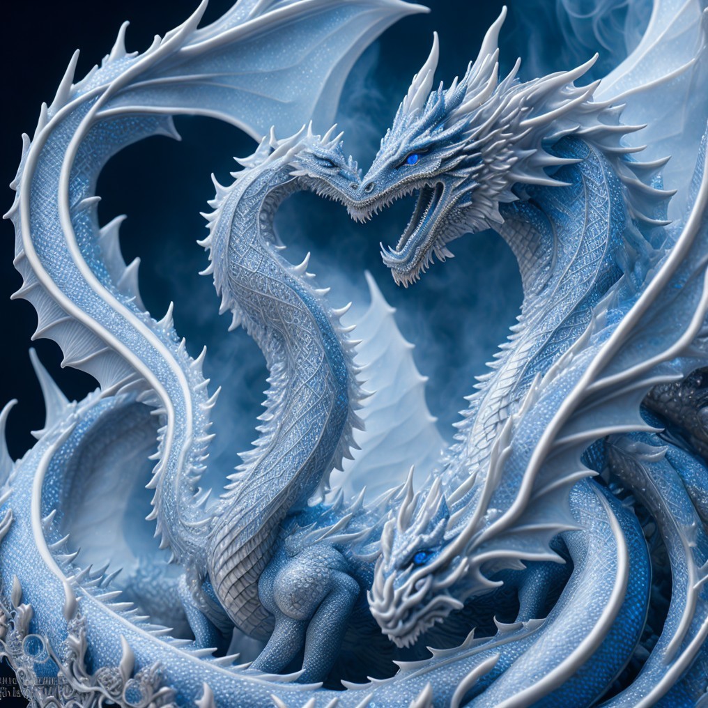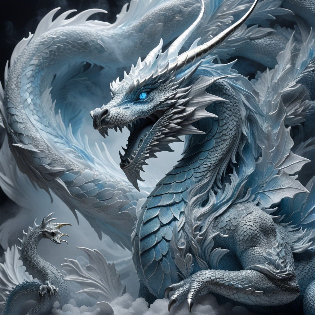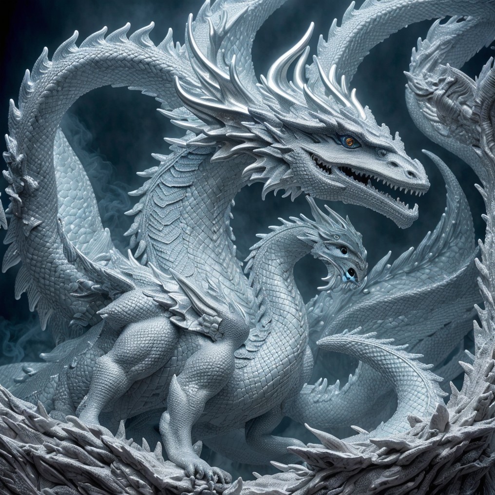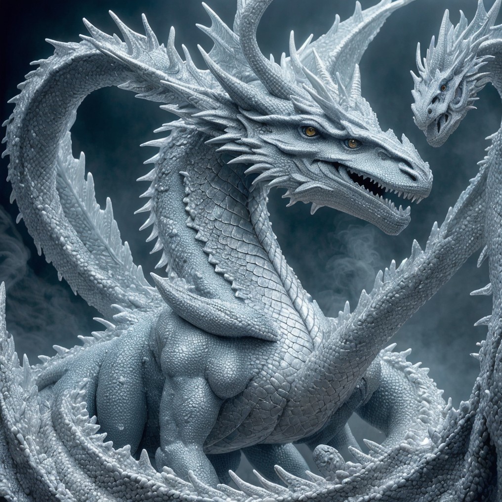 A fantastical creature with five serpentine heads, each adorned with icy blue scales and fierce expressions. Its intricately detailed body twists gracefully, radiating a mythical aura.