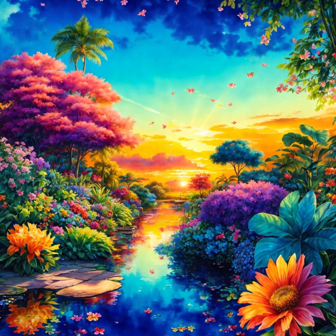 Prompt: Full page, single image, 3D watercolor patchwork, of a spectacular sunrise over a beautiful garden with tropical flowers with vibrant saturated colors, trees and plants with leaves in shades of azure blue and teal, golden sunrise rays shimmering over the scene, intricate, satiny, high quality, elegant, highly detailed, glistening magic style, in the very best style of Gustav Klimt, with elements in the style of Jan Toorop, with subtle elements in the style of Tingatinga