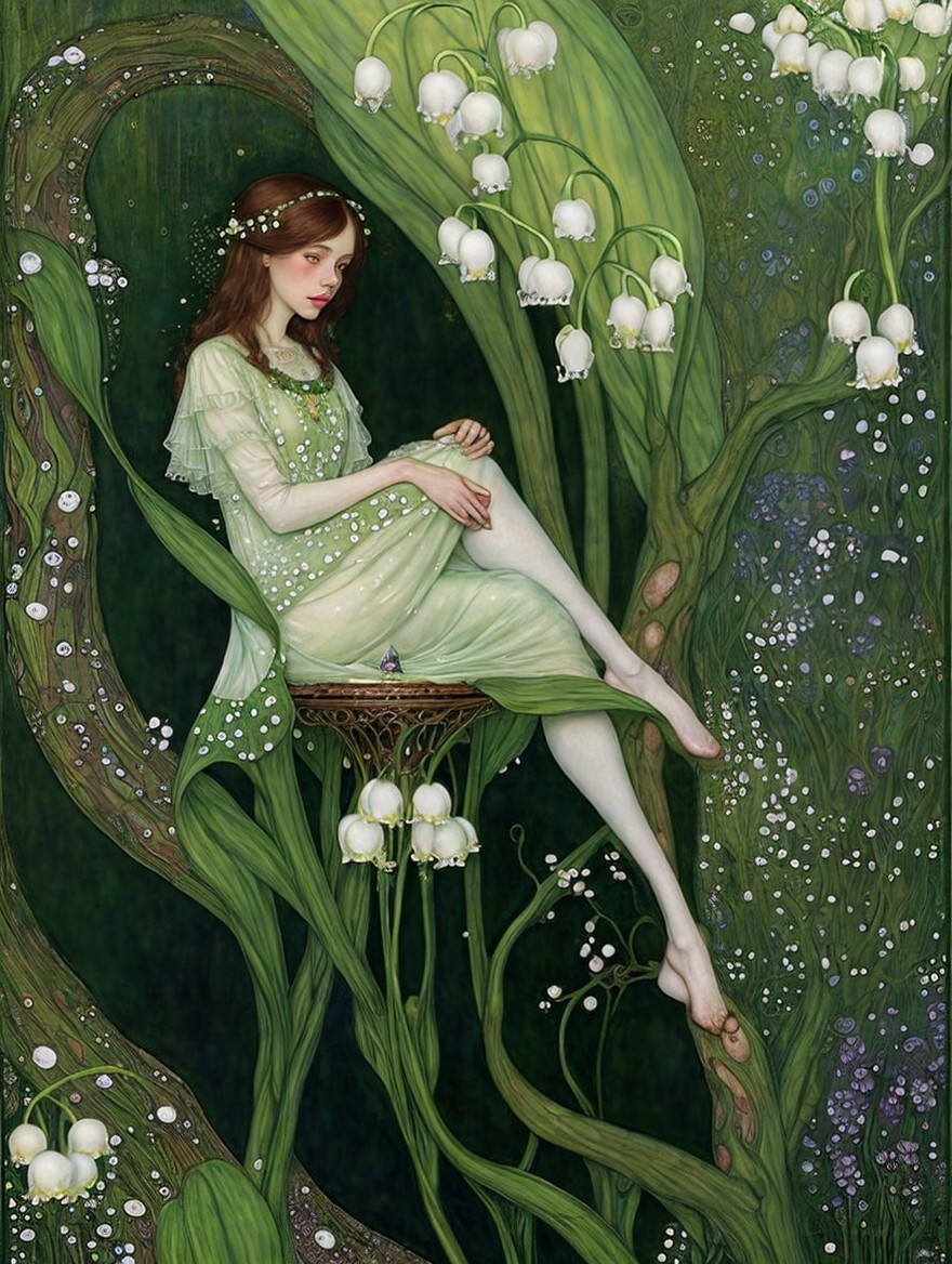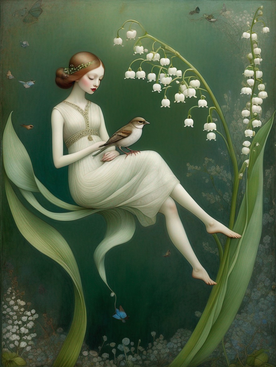 An ethereal illustration of a woman in a flowing dress seated on a lily of the valley, with a bird perched on the plant beside her.