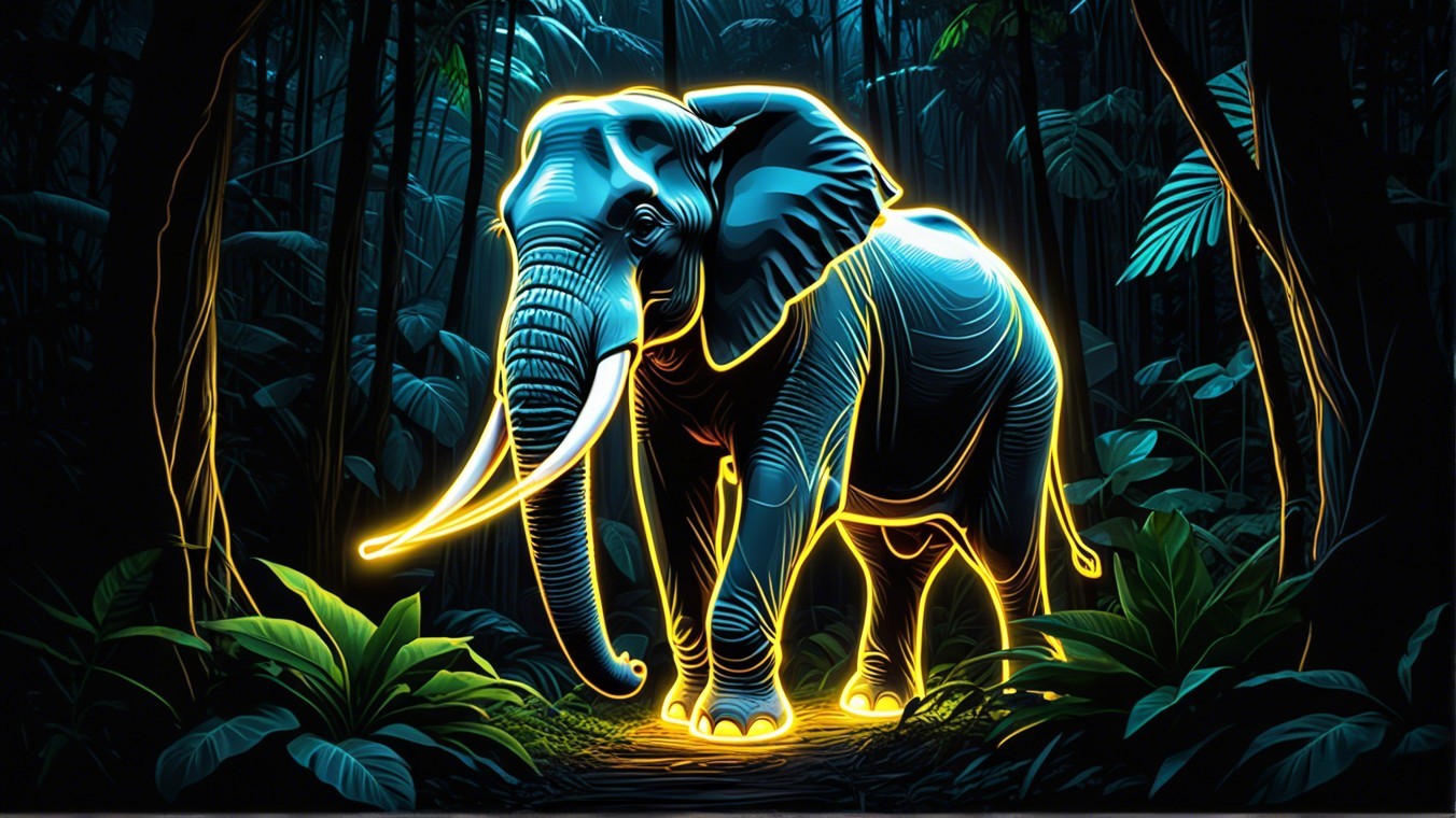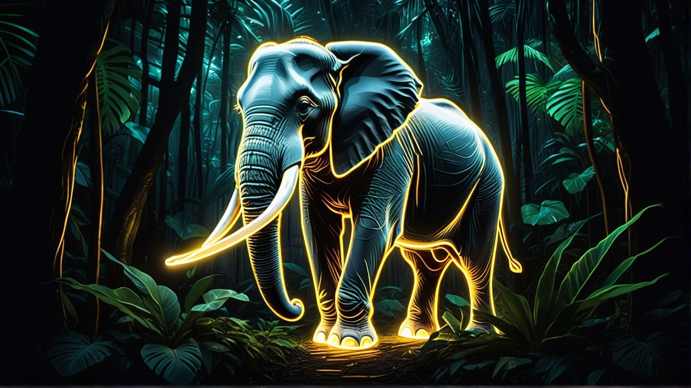 A vibrant, neon-lit elephant walks through a lush, tropical jungle. Surrounded by detailed foliage, the scene is both enchanting and strikingly colorful, creating a magical atmosphere.