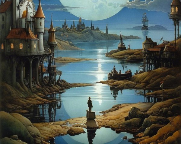 The painting depicts a vibrant coastal village with colorful houses, tall churches with red roofs, and lush greenery. Dramatic clouds float above, enhancing the serene seaside atmosphere.