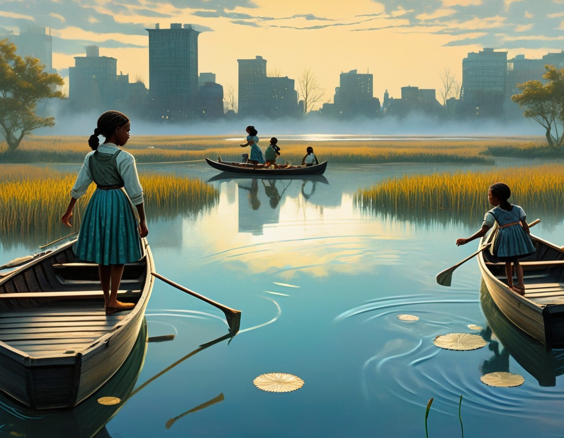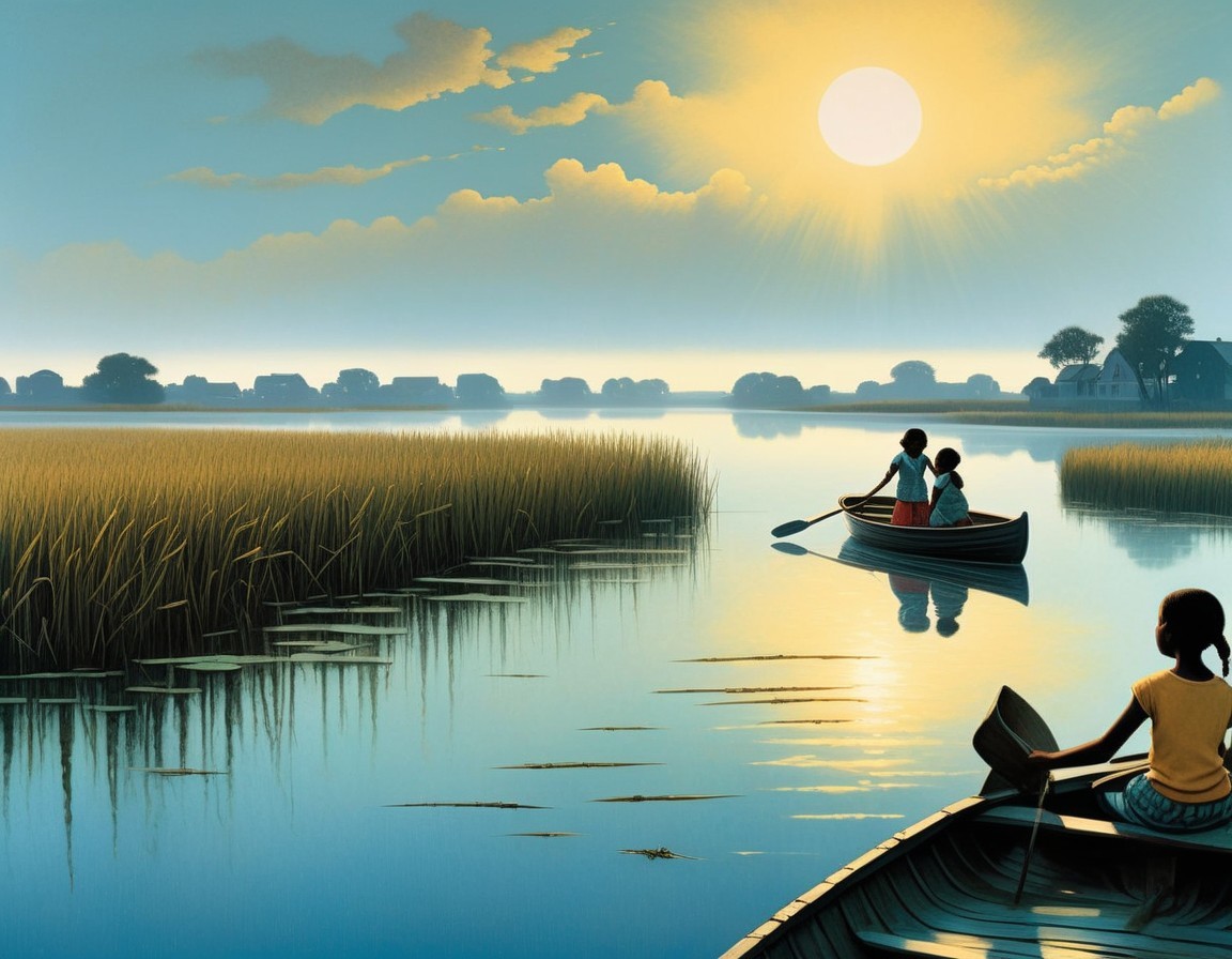 two young black girls navigating the waterways in an old rowboat, 1968, twilight on the marsh and the fogs are croaking, elimated sun in distance only clouds and light, off center design, blues and yellows, faded grey turquoise in the sky, more distinct lines in the linocut, faded colors, vintage, the meadowlands marsh in New Jersey, sorrounded by marsh flowers including flat topped white astor, Water hemlock, creeping water primrose, blue vervain, spotted joe pie weed, greater fringed gentian,, , more distinct lines in the lino cut, add pale grey turquoise to the sky, a scene viewed in New Jersey, night in August, Intricate linocut art of grasses and flowers and faded dried flower heads, light gray, pale light grey blue, soft grey pink, olive, rust and dark greens, kay sage, raw figuration,, trompe l'oeil compositions, rusticcore , .. surreal, beautiful