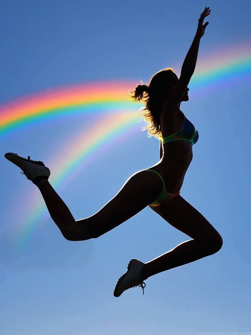 A silhouette of a woman leaping joyfully against a blue sky, with a vibrant rainbow arching overhead. She's wearing a colorful bikini, exuding energy and positivity.